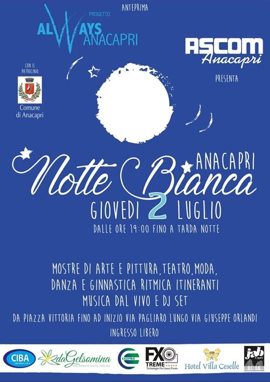 Nell’ ambito del progetto #alwaysanacapri , programma di eventi estivi ed autunnali a cura dell’ Ascom Confcommercio Anacapri , con il patrocinio del Comune di Anacapri invitiamo tutti voi e tutti i graditi ospiti della nostra Isola alla prima grande serata “La Notte Bianca”! Trovate tutte le info nella locandina che vi invitiamo a condividere il più possibile OVUNQUE! Sará. L occasione per ripartire, per dimostrare la nostra voglia di rinascita ! Invitiamo anche tutti gli esercenti, iscritti e non iscritti alla Ascom, di prevedere un orario di apertura prolungato per tutto il corso Orlandi da Piazza Vittoria al Bar Grotta Azzurra: ci sarà musica dal vivo, di set, teatro itinerante , danza e ginnastica, mostre fotografiche e pittoriche, passeggiata della moda , allegria, relax e tento altro … Ci raccomandiamo di rispettare le distanze di sicurezza e di non creare assembramenti , per un sereno svolgimento della serata. Noi partiamo da qui, Anacapri c’é…E tu ci sarai?