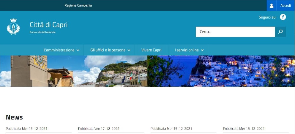 L’Amministrazione della Città di Capri ha trovato un nuovo modo di interagire con i propri cittadini. È ufficialmente online il nuovo sito istituzionale più semplice, chiaro e intuitivo. Ti invitiamo fin da ora a scoprire i nuovi contenuti del sito accessibile, perché risponde a tutte le linee guida AGID per l’accessibilità, e responsive perché comodamente consultabile da qualsiasi dispositivo: computer, smartphone e tablet.Se non trovi un contenuto puoi ancora navigare nel vecchio sito disponibile a questo indirizzo http://old.cittadicapri.itBuona navigazione