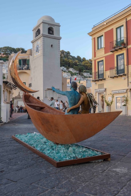 CAPRI – A Capri “Sognando la Luna”. La piazzetta salotto del mondo, icona e simbolo dello scoglio più famoso del mondo è da qualche giorno la “cartolina” di una nuova installazione artistica che sta già facendo il pieno di selfie e fotografie di turisti e vacanzieri. L’opera open air di Giacinto Bosco, per volontà di Liquid Art System, la rete di gallerie che da diverso tempo organizza manifestazioni di arte pubblica e condivisa e che ama allestire nei luoghi più rappresentativi dell’isola opere a tema di grande richiamo, sta già diventando la foto simbolo della stagione turistica 2024, che appena all’avvio di maggio è già calda in fatto di presenze e arrivi giornalieri. Un boom che conferma ancora una volta l’incredibile fascino dell’isola amata dall’imperatore Tiberio, in cima alle preferenze di viaggiatori sia italiani che stranieri. E l’imponente scultura in bronzo che ritrae due amanti che contemplano la luna, è ora meta prediletta delle migliaia di viaggiatori che stanno ormai affollando l’isola azzurra, confermando i numeri e le previsioni che la vedevano tra le località più gettonate a tal punto che sono diversi gli overbooking già in calendario ancor prima dell’ingresso dell’estate vera e propria prevista solo nella decade finale di giugno. Tornando all’opera di Bosco a Capri, protagonista per la seconda volta di un’installazione pubblica all’ombra del campanile, si tratta del tema prediletto dall’artista, “armonicamente immersa nel paesaggio circostante, incorniciata dall’azzurro del mare e del cielo che fanno da sfondo”. E, come spiegato da Franco Senesi, Ceo e fondatore della Liquid Art System, “la scelta di coniugare l’incanto delle opere di Bosco alla bellezza paesaggistica dell’ambiente circostante è stata quasi spontanea: le sue sono ‘sculture in movimento’, opere che definirei ‘parlanti’”.