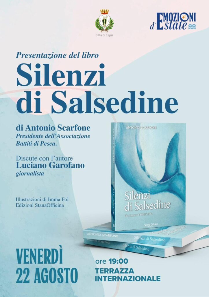 Si terrà a Capri venerdì 22 agosto alle ore 19 presso il Terrazzo Intenzionale la presentazione del libro Silenzi di salsedine, ne discuterà con l’autore il giornalista Luciano Garofano, il romanzo scritto da Antonio Scarfone con le illustrazioni di Imma Fol è edito da StranaOfficina edizioni di Sapri. Silenzi di salsedine è un viaggio intimo e profondo nel cuore del mare e nelle anime di coloro che lo solcano. Un racconto intriso di vento, onde e misteri, dove ogni silenzio porta con sé una storia non detta, e ogni tempesta è un riflesso delle battaglie interiori dei protagonisti. Riccardo, un giovane marinaio in cerca di sé, e il Capitano, uomo di mare e di segreti, navigano a bordo del Pallante, una tartana da pesca che diventa molto più di una semplice imbarcazione: è casa, rifugio, testimone di silenzi e confidenze. Insieme affrontano il buio delle notti infinite e la luce dell’alba che annuncia nuove speranze. La salsedine, silenziosa, si posa sulla pelle, penetra in profondità, lasciando segni che non se ne vanno mai. È il mare che si insinua nell’anima, come un compagno invisibile che non abbandona mai i marinai. Il mare, con i suoi misteri e la sua forza, si rivela non solo un elemento naturale, ma un riflesso dei loro animi. Il Pallante è custode di un diario di bordo speciale che raccoglie le emozioni e i pensieri dei protagonisti, appunti di vita e mare che trasudano di salsedine e di stati d’animo. Silenzi di salsedine diventa così una riflessione poetica sulla forza della natura, sugli incontri che segnano la vita, e sulle emozioni che ci guidano, tra momenti di sconfinato silenzio e improvvisi lampi di luce.