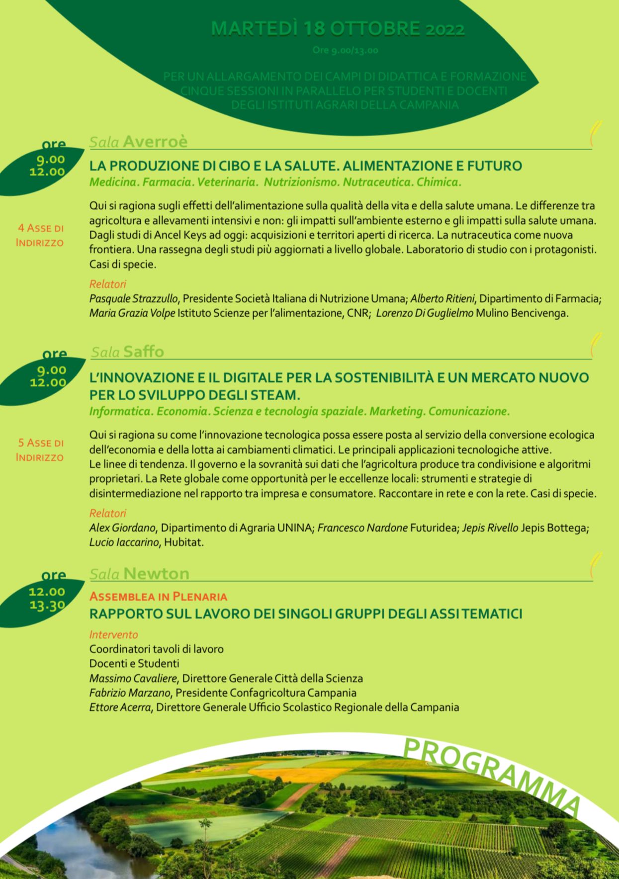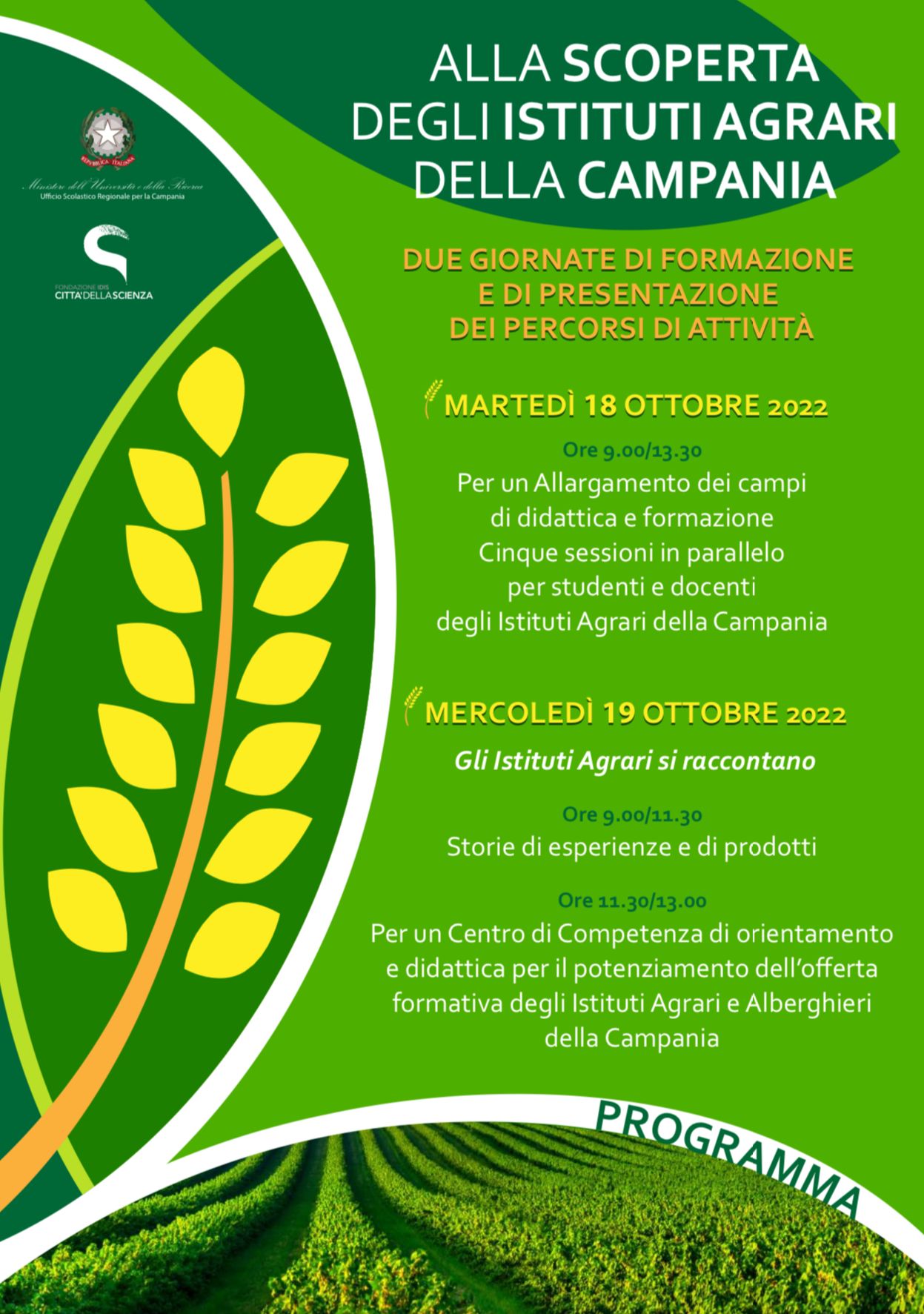 Sessioni, incontri, confronti, racconti, presente e futuro degli Istituti Agrari della Campania in una due giorni in calendario martedì 18 e mercoledì 19 ottobre a Napoli a Città della Scienza.
