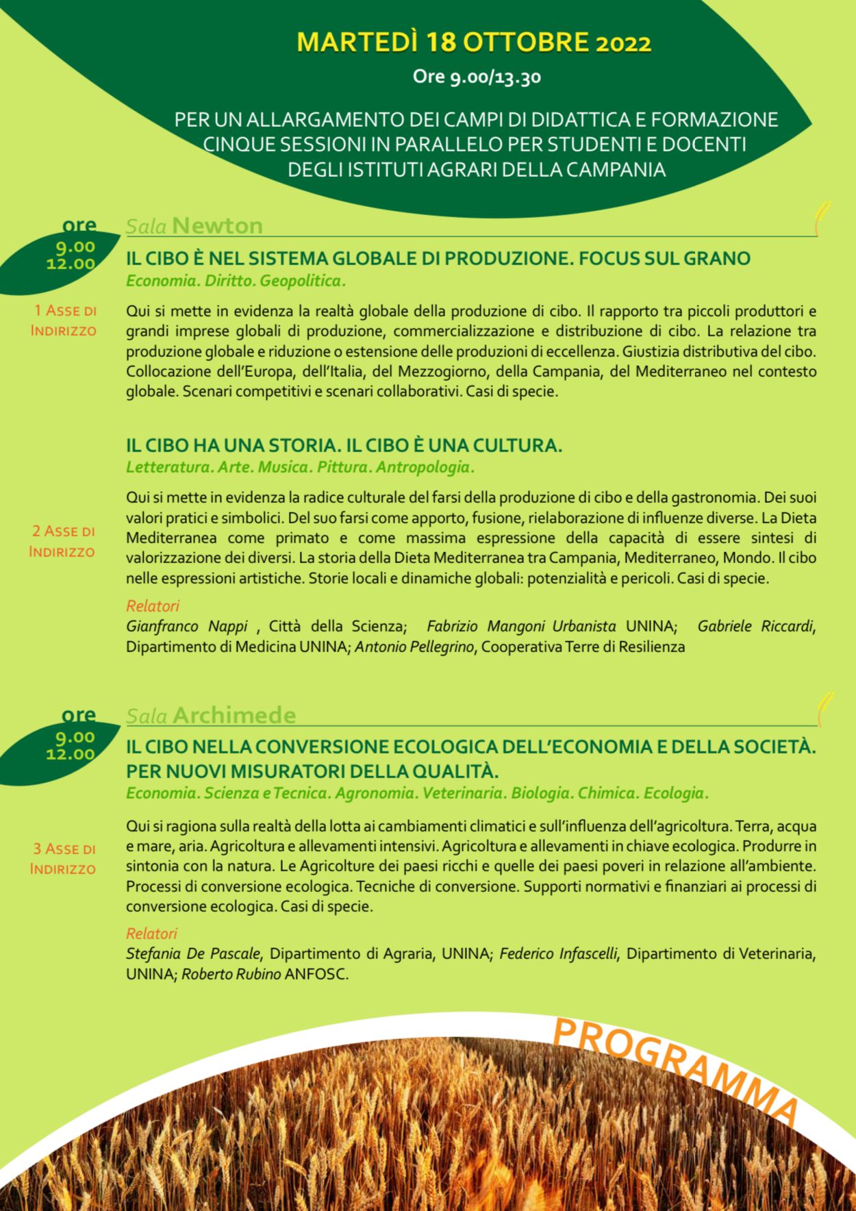 Programma della prima giornata sarà “Per un allargamento dei campi di didattica e formazione”. Cinque sessioni in parallelo per studenti e docenti degli Istituti Agrari della Campania. Dalle ore 9 alle ore 12 in Sala Newton in evidenza la realtà globale della produzione di cibo con la sessione dedicata al “Il cibo è nel sistema globale di produzione. Focus sul grano”.