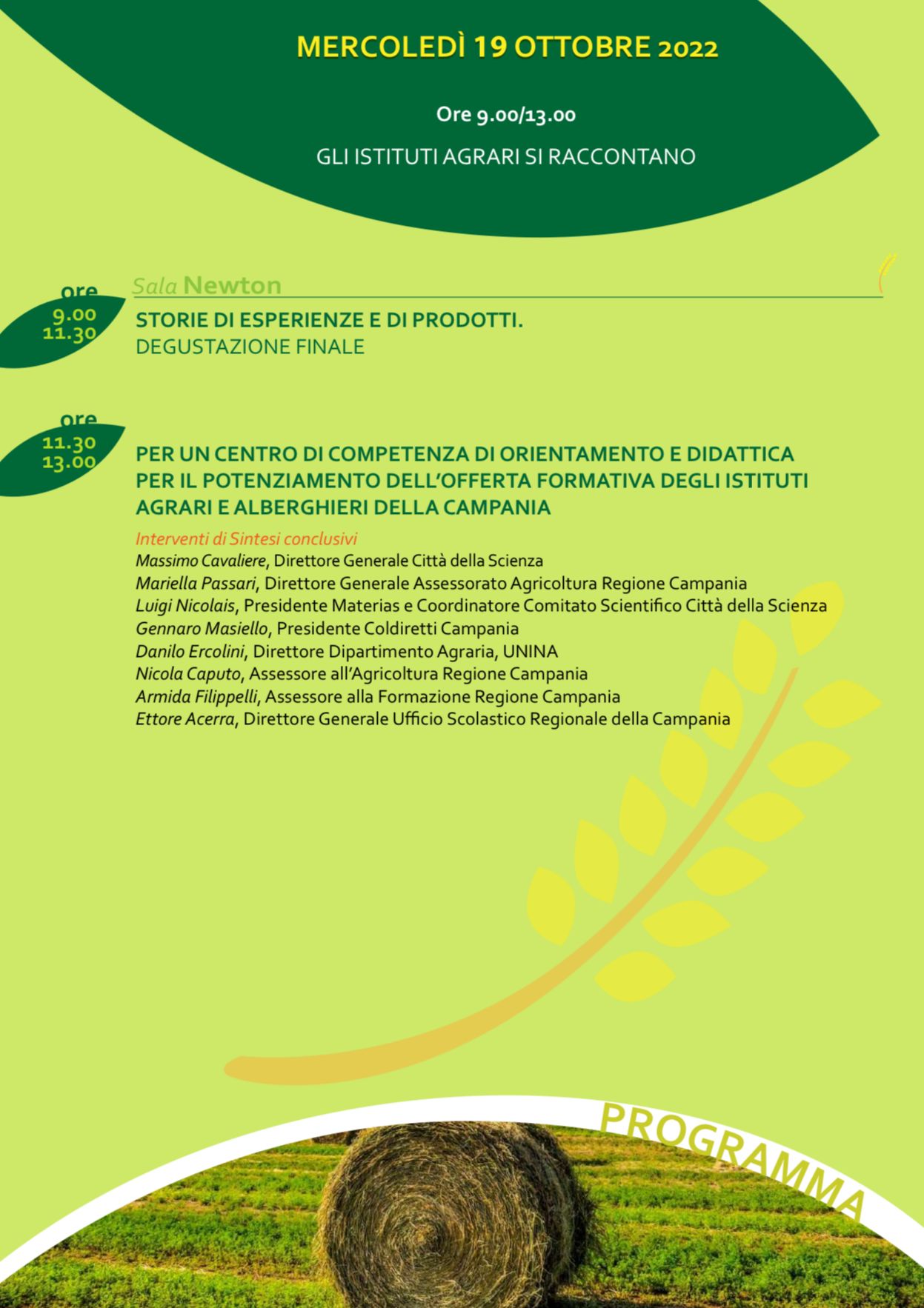 Il giorno dopo, invece, si aprirà con le “storie di esperienze e prodotti” degli istituti agrari con degustazione finale e gli interventi di sintesi conclusivi sulla tematica “Per un centro di competenza di orientamento e didattica per il potenziamento dell’offerta formativa degli Istituti Agrari e Alberghieri della Campania”. Interverranno: Massimo Cavaliere (Direttore Generale Città della Scienza), Mariella Passari, (Direttore Generale Assessorato Agricoltura Regione Campania), Luigi Nicolais, (Presidente Materias e Coordinatore Comitato Scientifico Città della Scienza), Gennaro Masiello, (Presidente Coldiretti Campania), Danilo Ercolini, (Direttore Dipartimento Agraria, UNINA), Nicola Caputo, (Assessore all’Agricoltura Regione Campania), Armida Filippelli, (Assessore alla Formazione Regione Campania), Ettore Acerra, (Direttore Generale Ufficio Scolastico Regionale per la Campania).