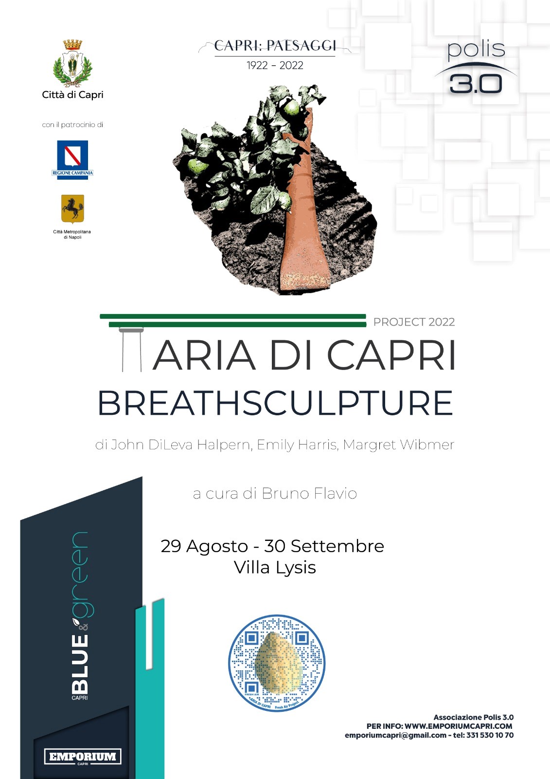 L’edizione 2022 di “Aria di Capri” ha visto l’organizzazione di una performance artistico-ambientale in vari luoghi di Capri nel mese di luglio 2022 durante la quale gli artisti John Halpern, Emily Harris, Margret Wibmer hanno trasmesso attraverso una simbolica ‘passeggiata’ in slow motion e con l’ausilio di QRCODE, messaggi di sensibilizzazione sul delicato rapporto uomo/natura. I percorsi sono stati inseriti in una narrazione concepita da Bruno Flavio per accompagnare l’osservatore alla scoperta della propria sensibilità ambientale. Al centro dei percorsi e della narrazione le ‘breathsculpures” nate dalla performance Fresh air di John Halpern. Nel 1989 in Olanda Halpern aveva vissuto in una casa di vetro ermeticamente sigillata per 10 giorni, 24 ore al giorno, respirando circa una volta al minuto, sopravvivendo esclusivamente grazie allo scambio di ossigeno-Co2 tra lui e le piante. Dopo la fine della performance, circa 10 metri cubi d’aria della casa di vetro erano stati compressi in tubi d’acciaio chiamati ‘sculture del respiro’ (breathsculpture appunto) che dovevano simboleggiare così l’interdipendenza tra uomo e ambiente.