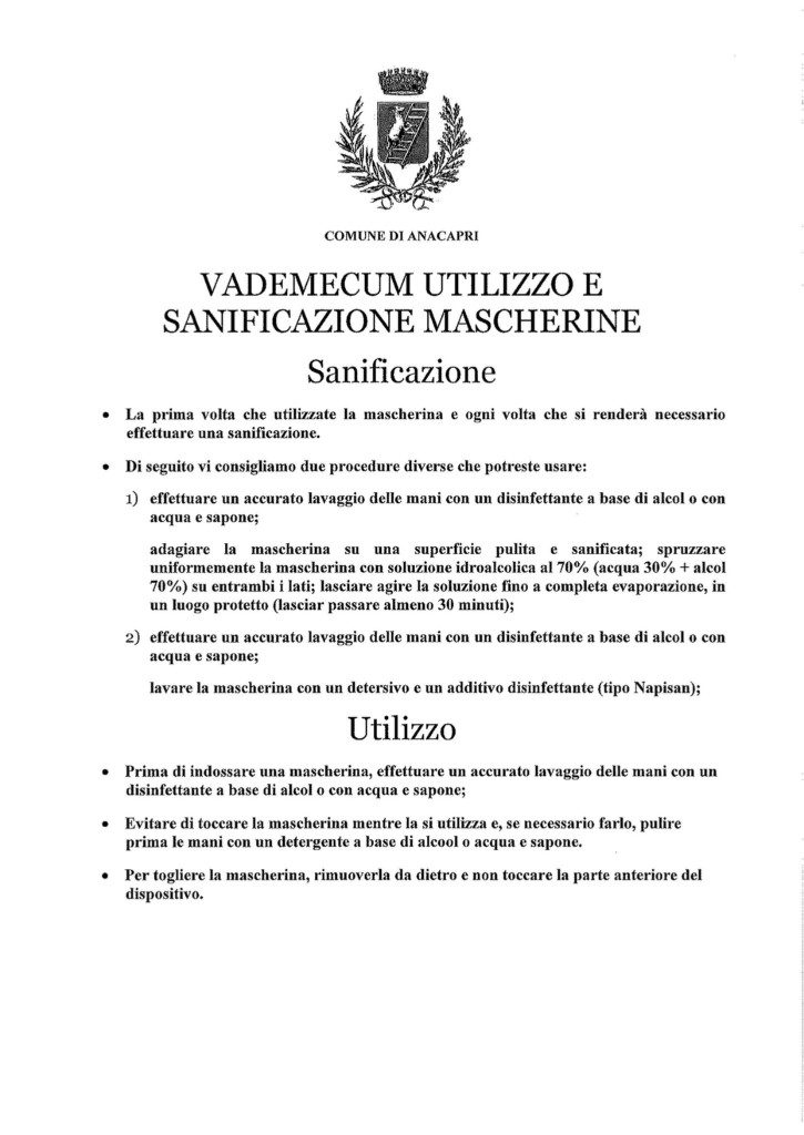 Nel corso della settimana, l’amministrazione comunale provvederà, sempre tramite i volontari, alla distribuzione porta a porta delle mascherine, insieme alle quali sarà consegnato anche un vademecum con le istruzioni per l’utilizzo e la sanificazione delle stesse, diffuso anche sui canali ufficiali del Comune.