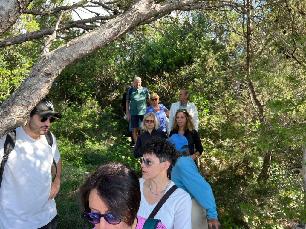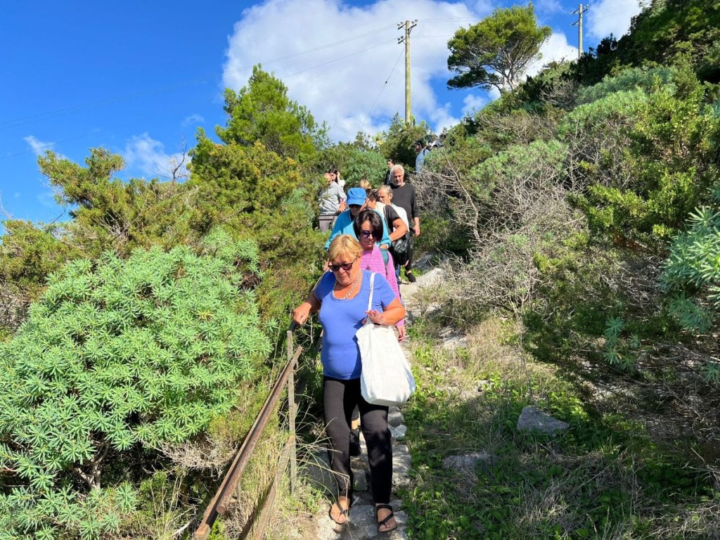 La tappa nell’area della Guardia é durata più a lungo per alcuni ospiti/artisti che sono stati guidati in disegni en plein air dall’illustratrice e architetto Simonetta Capecchi in un percorso di illustrazioni e immersione nella natura. La Capecchi ha di recente pubblicato un libro con Electa “Gli olivi di Capri, una storia di agricoltura eroica” dove documenta in un viaggio illustrato, lungo un anno solare, tutte le tappe dell’associazione L’Oro di Capri dalla potatura alla raccolta, dai percorsi educativi e didattici a quelli di ricerca sugli ulivi plurisecolari.