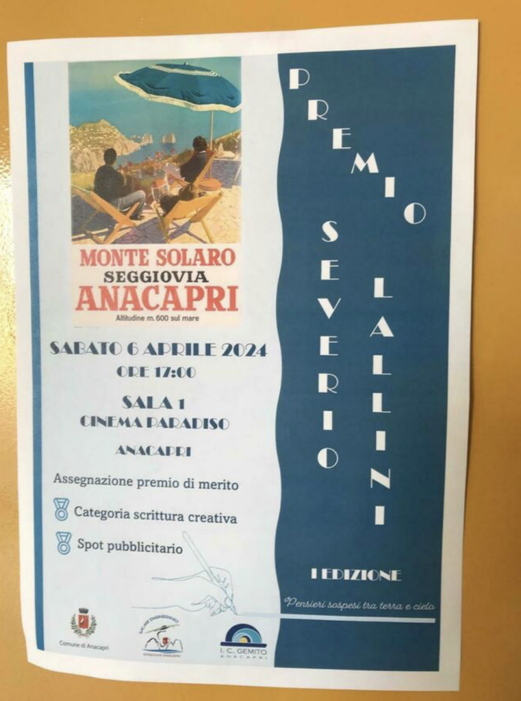 Ad Anacapri la prima edizione del “Premio Severio Lallini – pensieri sospesi tra terra e cielo”. Un concorso realizzato dall’Istituto Vincenzo Gemito di Anacapri in collaborazione con il Comune di Anacapri, promosso e fortemente voluto dalla famiglia Lallini, dedicato alla figura dell’ingegner Severio Lallini che nel 1998 rinnovò completamente, con la sua impresa SACMIF, la seggiovia che l’ingegner Francesco Uliscia, con grande lungimiranza, aveva ideato e costruito nel 1952 per collegare il centro di Anacapri con Monte Solaro , dando vita ad un salotto a cielo aperto, dove visitatori e turisti possono ammirare un paesaggio unico e mozzafiato. Il premio che quest’anno vede la sua prima edizione e che vuole ricordare così la figura dell’ingegner Severio Lallini e di sua moglie Giulia Favarato aveva come obiettivo “la circolazione e la conoscenza della scrittura creativa tra gli adolescenti, promuovendo la creatività in forma autentica, vivendola come una opportunità per valorizzare la ricchezza interiore di ciascuno, le esperienze e le molteplici sensibilità”. Il concorso è suddiviso in due categorie, la prima dedicata alla scrittura creativa, e che prevedeva realizzazione di un racconto breve sul tema dei trasporti nella loro accezione più ampia, come luogo di incontro, di emozioni, di pensieri e paure per immortalare un attimo o un evento, la seconda uno spot pubblicitario sul trasporto sostenibile per promuovere la mobilità sostenibile. Gli alunni primi classificati per ciascuna delle due categorie hanno vinto un viaggio studio di due settimane a Malta.