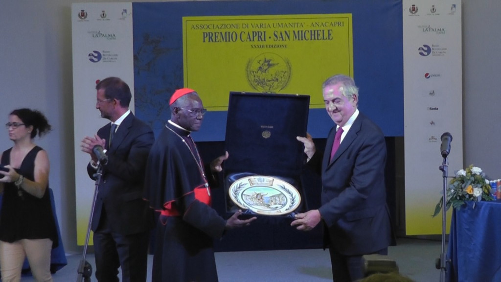 Anna Maria Boniello – Capri. È stato assegnato a Robert Sarah, cardinale della Nuova Guinea, il Premio CapriSan Michele 2016 per l’ opera «Dio o Niente» edita da Cantagalli. Un libro intervista in cui il cardinale risponde alle domande di Nicholas Diat raccontando la sua incredibile storia. Un racconto fatto di riflessioni personali argomentate dalle sue idee sul «neocolonialismo ideologico esercitato in Africa dall’ Occidente decadente». La cerimonia di premiazione, svoltasi nell’ Audorium del Centro Paradiso di Anacapri, ha visto la presenza delle istituzioni isolane, a partire dai sindaci di Anacapri e Capri Franco Cerrotta e Gianni De Martino e i componenti della giuria presieduta da Lorenzo Ornaghi e composta dal presidente onorario Francesco Paolo Casavola, Grazia Bottiglieri Rizzo, Ermanno Corsi, Don Vincenzo De Gregorio, Marta Murzi Saraceno, Raffaele Vacca. Al giornalista del Mattino Vittorio Del Tufo, dell’ ufficio del Redattore Capo Centrale, è stato assegnato il premio di Giornalismo dedicato ad Italo De Feo. Del Tufo ha ricevuto il premio dalle mani di Diana De Feo anch’ ella giornalista, figlia del grande intellettuale che fu giornalista e scrittore di spicco, ricoprendo vari ruoli nel mondo del giornalismo, della Rai, della politica, affermando sempre i suoi principi liberali. Principi che sono racchiusi nella motivazione del premio che viene attribuito ogni anno ad un giornalista «il quale con l’ insieme della sua opera abbia messo in luce la situazione e le potenzialità del Mezzogiorno». Il Premio Capri San Michele, che quest’ anno festeggia il suo trentatreesimo anniversario, come ogni anno è stato preceduto da un convegno che quest’ anno era incentrato sul tema «Il Valore delle Costituzioni». Un forum che si è svolto nella sala Mario Cacace con il dibattito aperto dal ex ministro Lorenzo Ornaghi che presiede la giuria ed ha visto gli interventi di Antonio Iodice, il prof. Giovani Palladino, il senatore Francesco De Notaris e Grazia Bottiglieri con le conclusioni affidate ad Ermanno Corsi. Il presidente dell’ Associazione di Varia Umanità Raffaele Vacca e l’ Assessore al Turismo Massimo Coppola hanno consegnato ad Angelo Federico e ad Ernesto Ernesto Mazzetti il premio consistente nel prestigioso piatto in ceramica che riproduce il pavimento della chiesa di San Michele. Nel corso della due giorni del Premio San Michele la giuria ha poi proclamato il vincitore del premio Tiberio Alberto Quadro Curzio, del premio di Varia Umanità Carmine Castellano, del Premio Riviste Humanitas, il Premio Anacapri a Lucia Arbace ed il Premio Laura Rolandi ad Anna Maria Cerrotta.