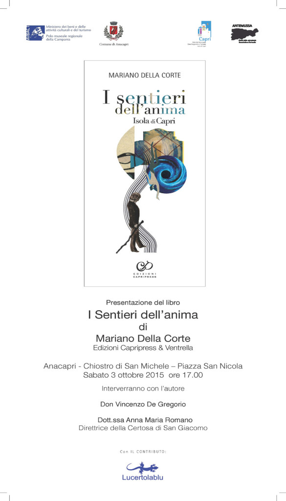 Verrà presentato sabato 3 ottobre alle ore 17 ad Anacapri, al chiostro di San Michele in Piazza San Nicola, il libro di Mariano Della Corte “I sentieri dell’anima”, Capripress e Ventrella editori con la partecipazione di Lucertolablu. Insieme all’autore inteverranno don Vincenzo De Gregorio e la direttrice della Certosa di San Giacomo Anna Maria Romano. (Clicca sull’immagine a lato per visualizzare la locandina)