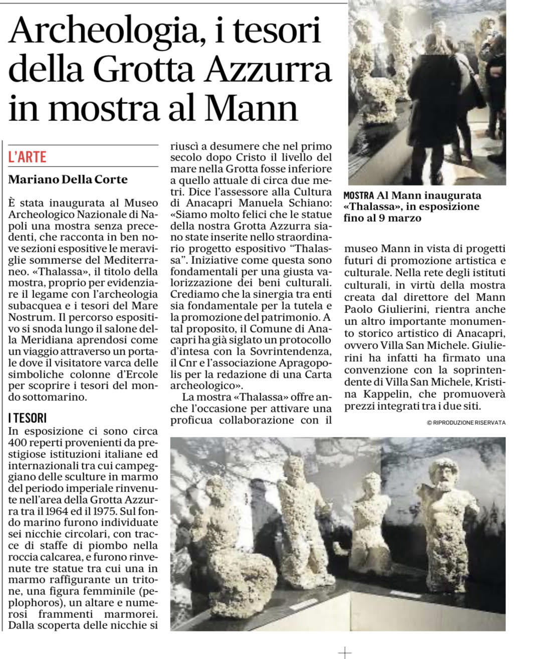 In esposizione ci sono circa 400 reperti provenienti da prestigiose istituzioni italiane ed internazionali tra cui campeggiano delle sculture in marmo del periodo imperiale rinvenute nell’area della Grotta Azzurra tra il 1964 ed il 1975. Sul fondo marino furono individuate sei nicchie circolari, con tracce di staffe di piombo nella roccia calcarea, e furono rinvenute tre statue tra cui una in marmo raffigurante un tritone, una figura femminile (peplophoros), un altare e numerosi frammenti marmorei. Dalla scoperta delle nicchie si riuscì a desumere che nel primo secolo dopo Cristo il livello del mare nella Grotta fosse inferiore a quello attuale di circa due metri. Dice l’assessore alla Cultura di Anacapri Manuela Schiano: «Siamo molto felici che le statue della nostra Grotta Azzurra siano state inserite nello straordinario progetto espositivo Thalassa. Iniziative come questa sono fondamentali per una giusta valorizzazione dei beni culturali. Crediamo che la sinergia tra enti sia fondamentale per la tutela e la promozione del patrimonio. A tal proposito, il Comune di Anacapri ha già siglato un protocollo d’intesa con la Sovrintendenza, il Cnr e l’associazione Apragopolis per la redazione di una Carta archeologico».La mostra «Thalassa» offre anche l’occasione per attivare una proficua collaborazione con il museo Mann in vista di progetti futuri di promozione artistica e culturale. Nella rete degli istituti culturali, in virtù della mostra creata dal direttore del Mann Paolo Giulierini, rientra anche un altro importante monumento storico artistico di Anacapri, ovvero Villa San Michele. Giulierini ha infatti ha firmato una convenzione con la soprintendente di Villa San Michele, Kristina Kappelin, che promuoverà prezzi integrati tra i due siti.