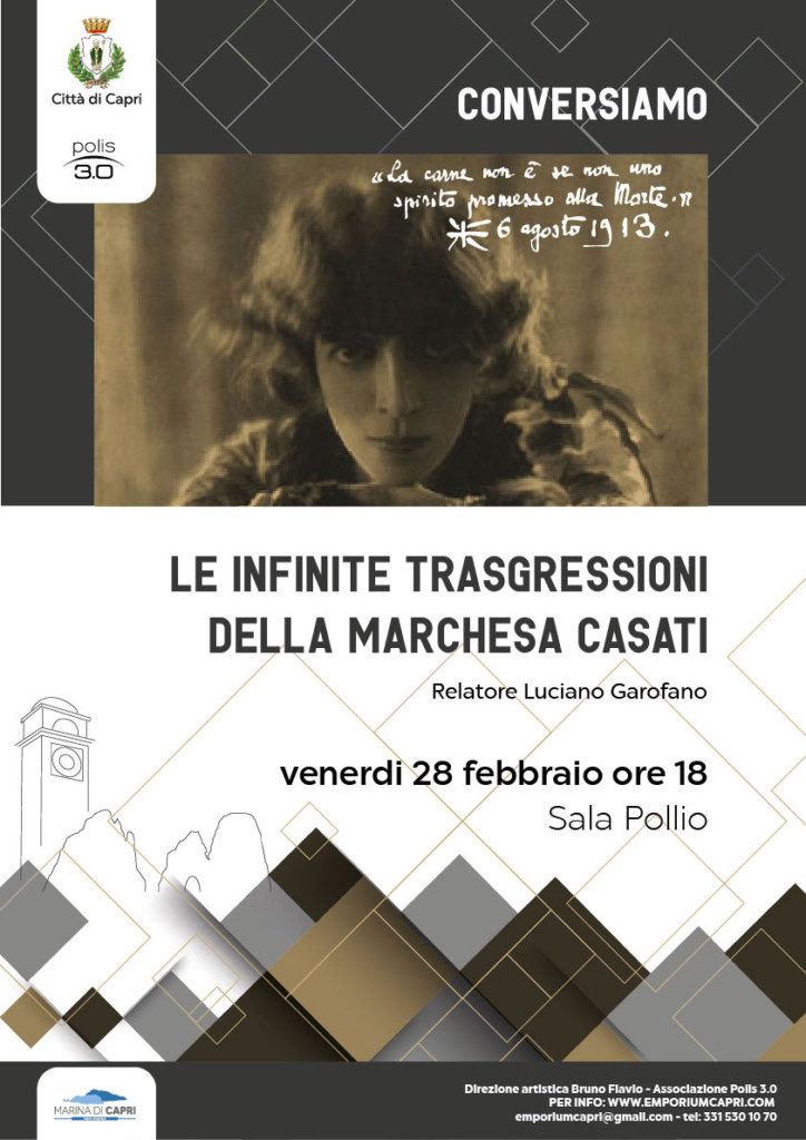 Oggi pomeriggio, alle ore 18.00 nella sala Pollio, incontro con l’autore Luciano Garofano per parlare di “Le infinite trasgressioni della Marchesa Casati”.