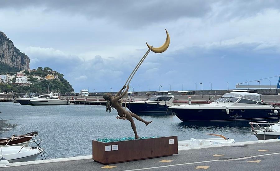 Altalena sulla Luna, la scultura life-size in bronzo di Giacinto Bosco lascia la Piazzetta ma non l’Isola di Capri.Visto il successo di pubblico che l’ha vista protagonista dallo scorso aprile di migliaia di scatti di turisti e vacanzieri, l’opera, parte della collezione dalla galleria Liquid Art System di Franco Senesi, ha trovato una nuova “casa” al Porto Turistico , proprio a due passi dal mare, sul romantico borgo di Marina Grande.L’idea di installare in spazi pubblici opere di dimensioni importanti, sceniche e particolarmente comunicative non è nuova per il circuito di gallerie di Senesi che sceglie con accuratezza i lavori più attrattivi del suo parterre di artisti , rappresentati negli spazi espositivi di Capri, Positano, Ravello e nelle fiere d’oltreoceano, come l’imminente Art Miami dove la Liquid si conferma da diversi anni tra i principali attori della settimana più ambita per collezionisti, galleristi, artisti e art dealer. ” Ringraziamo il Comune di Capri che accoglie sempre di buon grado le nostre proposte artistiche , dando la possibilità di creare un contatto diretto, al di fuori della galleria, tra le nostre opere e i visitatori di tutto il mondo che popolano l’isola durante l’estate. E da oggi diciamo grazie al Porto Turistico per la sensibilità dimostrata nell’accogliere l’opera di Bosco che costituirà il primo benvenuto e l’ultimo arrivederci per chi sceglie di frequentare la nostra isola anche in bassa stagione.” Commenta, soddisfatto del nuovo scenario offerto alla scultura, Senesi.