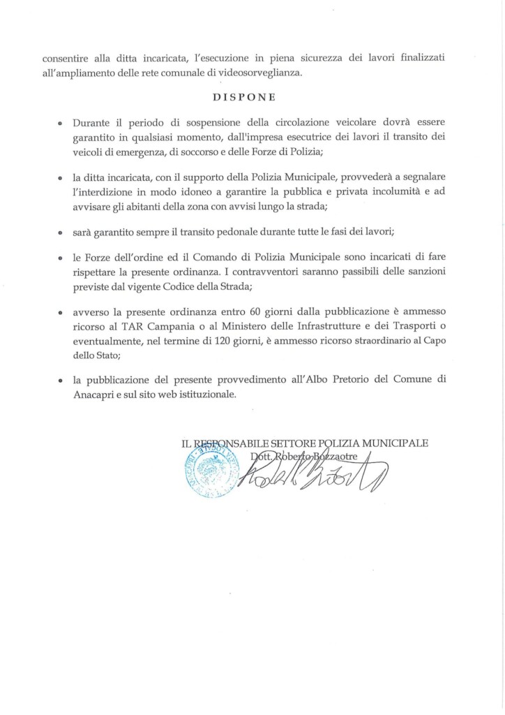 Anacapri: 8 e 9 ottobre chiusa via P.R. Giuliani