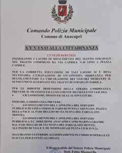 Anacapri, da lunedì chiuso per lavori tratto via Caprile – piazza Caprile