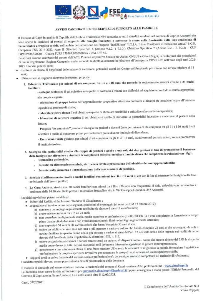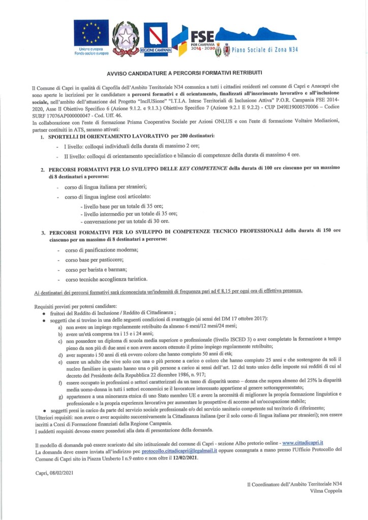 Vi ricordiamo che fino al 12.02.2021 è possibile inoltrare domanda per percorsi formativi retribuiti e per servizi di supporto alle famiglie. Bando e domanda sono scaricabili sul sito istituzionale del Comune di Anacapri nella sezione news in primo piano