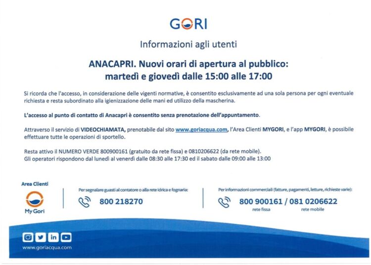 Anacapri: Gori comunica i nuovi orari di apertura al pubblico, al punto di contatto