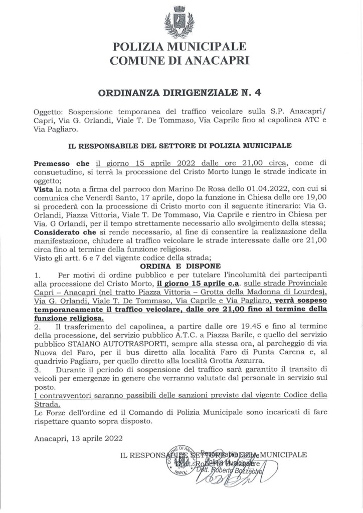 ordinanza 14: sospensione temporanea del traffico veicolare sulla S.P. Anacapri/Capri, Via G. Orlandi, Viale T. De Tommaso, Via Caprile fino al capolinea ATC e Via Pagliaro in occasione della processione del Cristo Morto prevista il 15.04.2022