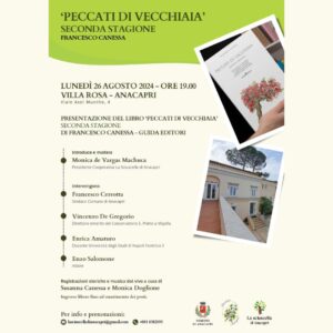 Anacapri: Presentazione del Libro “Peccati di vecchiaia (seconda stagione)” di Francesco Canessa Lunedì 26 agosto 2024 alle ore 19:00 presso Villa Rosa Anacapri