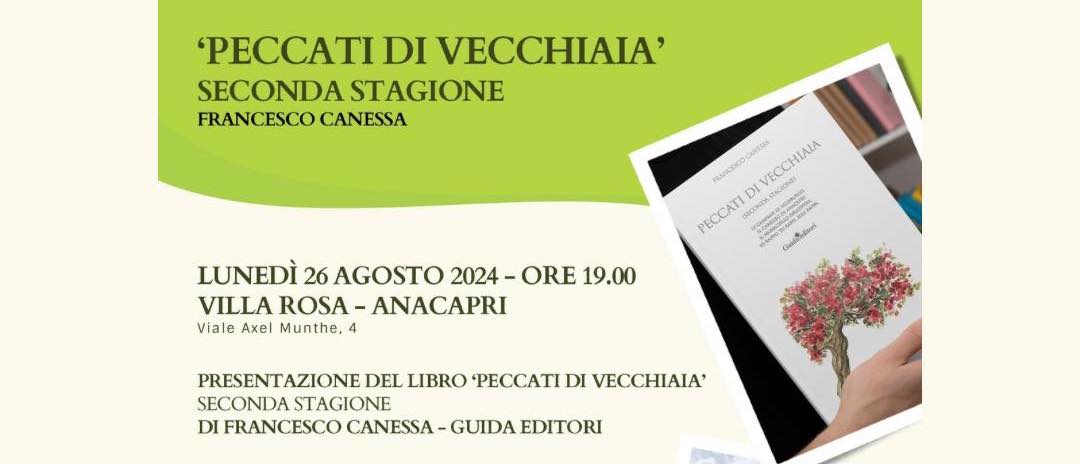 Anacapri: Presentazione del Libro “Peccati di vecchiaia (seconda stagione)” di Francesco Canessa Lunedì 26 agosto 2024 alle ore 19:00 presso Villa Rosa Anacapri