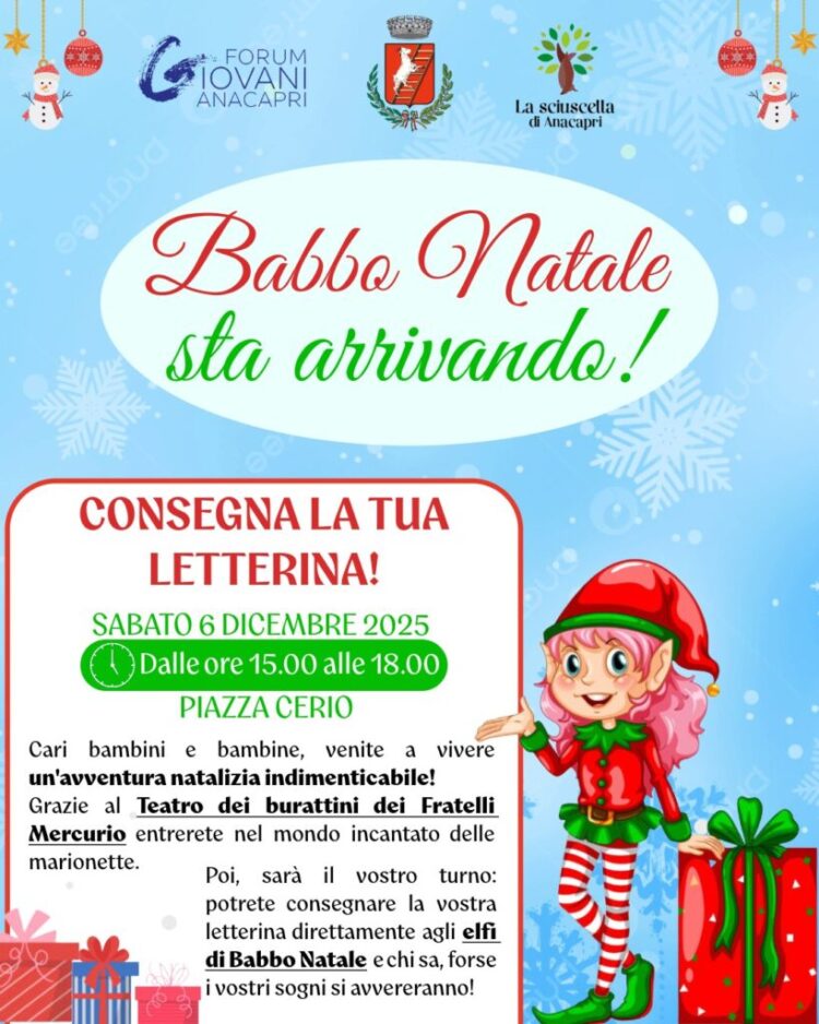 Sabato 6 dicembre in piazza Cerio dalle ore 15 alle ore 18  il Teatro dei burattini dei Fratelli Mercurio e poi arrivabo gli Elfi per raccogliuere le letterine inviate dai bambini a Babbo Natale