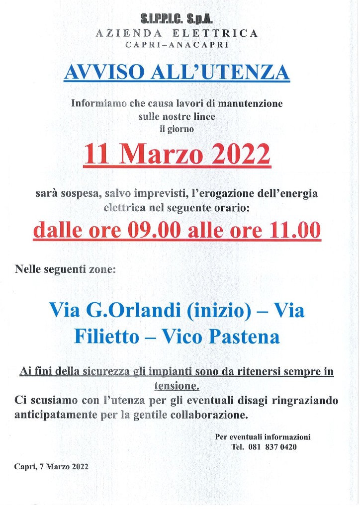 Anacapri, sospensione di energia elettrica per lavori nella mattinata dell’11 marzo