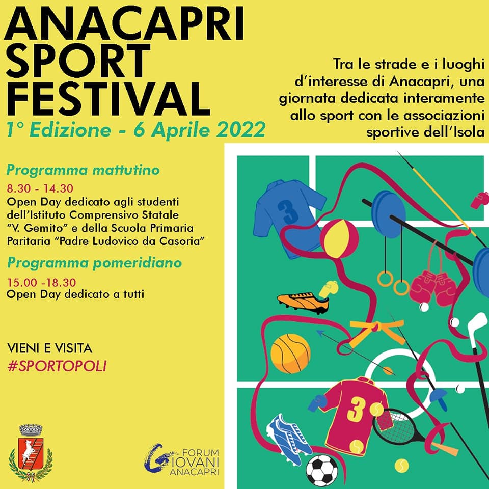 In occasione della Giornata Internazionale dello Sport per lo sviluppo e la pace 2022 che cade questo 6 Aprile, il Comune di Anacapri e il Forum dei Giovani di Anacapri sono lieti di presentare la primissima edizione dell’Anacapri Sport Festival, una giornata dimostrativa dedicata allo sport e al suo avviamento fra i giovanissimi. L’evento si svolgerà tra le strade e i luoghi d’interesse del territorio anacaprese e vedrà il coinvolgimento delle società sportive isolane. ll programma della giornata è articolato in due parti: la mattina dalle 8.30 alle 14.30 l’iniziativa sarà interamente rivolta agli studenti dei plessi scolastici Istituto Comprensivo Statale “Vincenzo Gemito” e Scuola Primaria Paritraria “Padre Ludovico da Casoria”, che verranno guidati dai Ciceroni attraverso il percorso a tappe – “Sportopoli”- durante il quale sarà possibile assistere alle dimostrazioni delle attività promosse da ogni società sportiva. Al termine della mattinata didattica, e fino alle 18.30, la partecipazione sarà invece aperta a tutti, con lezioni aperte, esibizioni, dimostrazioni, spettacoli. La mappa sarà articolata in vari punti:- EX ARENA COMUNALE (Basket) – Olimpia Capri- CAMPI DI CERIO (pallavolo, tiro con l’arco, arrampicata) – Twister Capri, Arcieri Barbarossa, Arco Club Capri, Capri Outdoors- PIAZZA VITTORIA (rollerblade) – Anacapri in Line- SPORTING CLUB (tennis, calcio maschile e femminile, arti marziali, tennis tavolo) – Sporting Club Capri, Tennis Club Capri, ASD Calcio Germano Bladier, ASD Anacapri Calcio, Judo Capri, Pro Fighting Capri, Tennis Tavolo Capri- PIAZZETTA TORRE (ciclismo, atletica) – Poly Running, La lucertola azzurra Bike- PIAZZA A. DIAZ (ginnastica ritmica) – Sirenide- PIAZZA CERIO (danza) – Isola Danza- MEDIATECA M. CACACE (yoga, vela, scacchi) – CapriYoga&Lab, Yacht Club Capri, Club Scacchi Capri Al fine di garantire la massima sicurezza della manifestazione, oltre alla logistica che sarà gestita dai membri del Forum vi sarà il supporto della Polizia Municipale di Anacapri e della Protezione Civile. Vi aspettiamo!