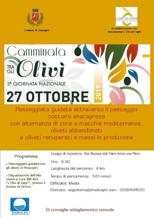 Il comune di Anacapri, in collaborazione con l’Associazione Nazionale Città dell’Olio e con l’Associazione L’Oro di Capri promuove la Terza giornata Internazionale Camminata tra gli Olivi