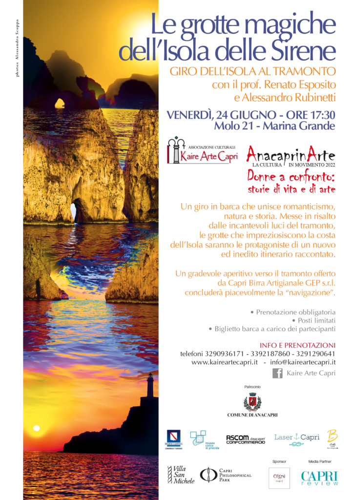 Per godere insieme di questa opportunità di vivere e gioire della meravigliosa Isola di Capri, l’appuntamento per “Le magiche Grotte dell’Isola delle Sirene” è venerdì 24 giugno, ore 17.30 Largo Fontana – Marina Grande.