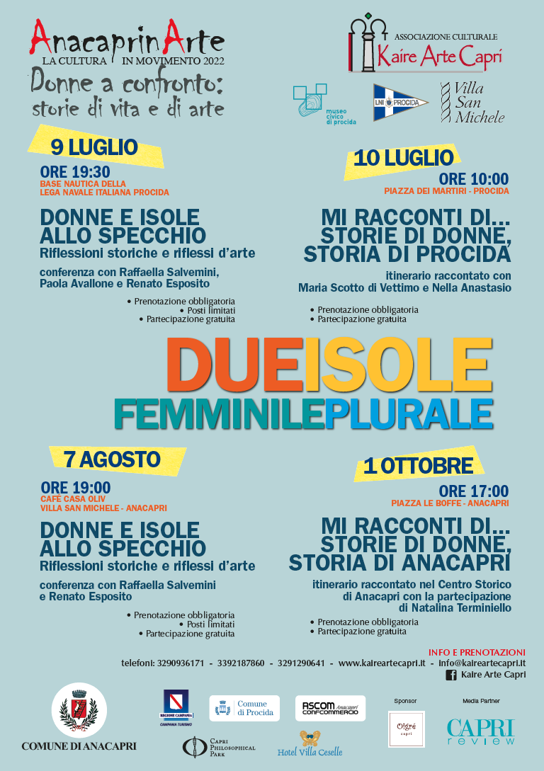 Per “Donne a confronto: storie di vita e di arte”, la rassegna che ha come tema centrale la donna e che rientra nel programma di eventi “ANACAPRINARTE – la cultura in movimento”2022, la Kaire Arte Capri propone due eventi culturali dedicati alla Capitale Italiana della Cultura 2022 per mettere a confronto, tra similitudini e differenze, le due isole di Procida e Capri attraverso figure femminili, note e meno note, che ne hanno fatto la storia o quali custodi delle tradizioni. Un omaggio a imprenditrici locali e affascinanti modelle, ma anche ad artiste che hanno avuto un legame autentico e profondo con le due Isole.