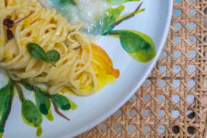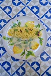 Tagliolino al Limone su base di battuto di Gambero Rosso — un piatto che racchiude l’essenza di Capri, dove i profumi agrumati dell’isola incontrano la dolcezza e la freschezza assoluta del crudo di mare, in un equilibrio raffinato tra intensità, freschezza e armonia gustativa.