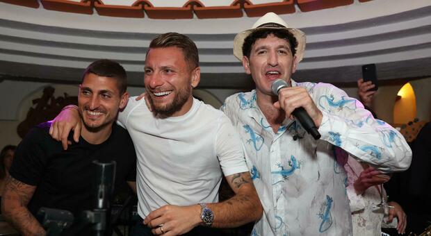 All’improvviso scoppia la festa all’Anema e Core per l’arrivo a sorpresa di Ciro Immobile e Marco Verratti, i due campioni della nostra Nazionale. Un’occasione che Gianluigi Lembo patron del locale non si è fatto scappare coinvolgendo immediatamente i due giocatori a unirsi a lui e la band per dar vita ad un mini-show canoro sul celebratissimo palco della Taverna. L’invito è stato raccolto e mentre si scatenava il pubblico in sala, è iniziata la sarabanda musicale con il motivo di rito per i frequentatori dell’Anema e Core “A Città e Pulecenella” ad unirsi all’applauso sono state anche le compagne di Ciro Immobile e Marco Verratti, Jessica Melena e Jessica Aidi. Jessica Aidi, moglie di Verratti, centrocampista del Paris Saint-Germain e della Nazionale Italiana, che nel 2021 ha sposato l’affascinante top-model francese. Fragoroso è stato l’applauso di Jessica Melena, al marito Ciro Immobile, l’attaccante della Lazio e della Nazionale, nel ruolo di cantante. La tenacia artistica di Gianluigi è continuata per diverso tempo a tenere i campioni sul palco, sino alla sigla finale che è diventato l’inno del Napoli “Oi vita, oi vita mia – cioè O’ Surdato Nnammurato” tra l’entusiasmo del pubblico che entusiasta si univa al coro.