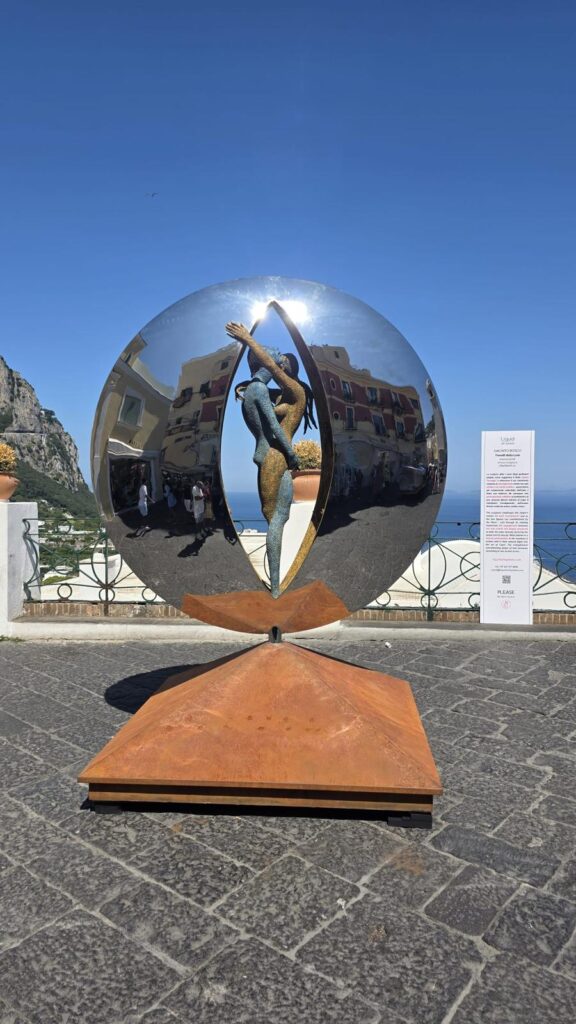 Da sempre luogo simbolo dell’isola azzurra, punto di riferimento per turisti in cerca di mondanità, negli ultimi tempi è location per opere d’arte e installazioni secondo un programma di interventi pubblici ideato da Liquid Art System, il circuito di gallerie di Franco Senesi; a giugno e luglio ha ospitato «Forest guardian» del duo spagnolo Coderch & Malavia, una monumentale scultura che raffigura un cervo per un contrasto tra la natura selvaggia e il lusso che si respira sull’isola. Il lavoro si sposterà di poco, trovando casa negli esterni dell’hotel Caesar Augustus di Anacapri. Invece all’ombra del celebre campanile da oggi c’è una nuova creazione, stavolta del siciliano Giacinto Bosco. Si chiama «Travolti dalla luna» ed è una scultura in bronzo di quasi tre metri di altezza che rappresenta due amanti colti in un romantico abbraccio. Le due figure si trovano all’interno di una sfera metallica ed è possibile scorgerle da una fessura ovale; lo sfondo che incornicia la scultura non è neutrale ma concorre ad aumentarne le suggestioni, immersa com’è nel paesaggio circostante ed incorniciata dall’azzurro del mare e del cielo che fanno da quinta naturale. «L’opera sfida i sensi degli spettatori: attraverso il suo movimento rotatorio, il coinvolgimento risulta non solo artistico ma anche emotivo. Il metaforico travolgimento dell’amore diviene realtà da vedere, sentire, vivere. La solidità del bronzo è messa al servizio della leggerezza dei sentimenti» è il commento di Senesi. Un po’ tutti i lavori di Bosco, spiega, «rappresentano piccoli idilli amorosi e hanno un grande dinamismo: sono sculture in movimento o parlanti. Il potere comunicativo delle sue installazioni è legato all’universalità del messaggio che trasmettono, alla capacità di arrivare al pubblico in modo diretto ed immediato». Bosco ha seguito una formazione che definisce rinascimentale, guadagnata con una gavetta solida, a bottega; nato nel 1956, a 15 anni si è trasferito a Milano dove ha lavorato per una fonderia d’arte. Parlando della sua produzione, dice: «Rifletto su sentimenti che sono comuni a tutti, come l’amore, lo stupore, la luna che è la cifra espressiva cui sono più legato. Le mie sculture sono dei racconti, molto spesso ispirati alla poesia, storie romantiche, ed io credo che le persone, oggi più che mai, abbiano bisogno di questo, di bellezza e di sogni».