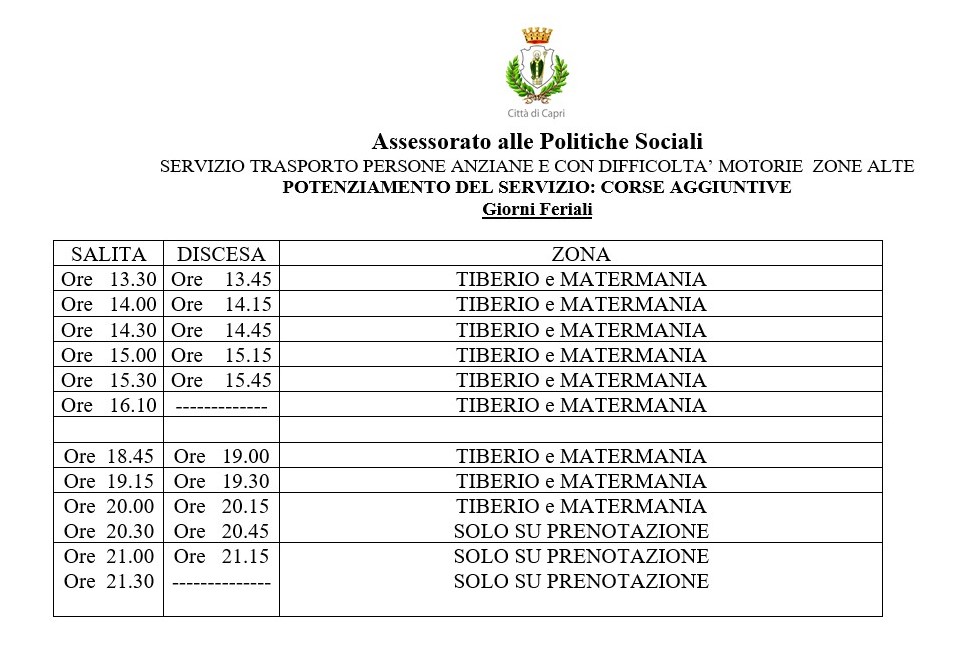 Assessorato alle Politiche Sociali. Da oggi potenziato il servizio di trasporto sociale per le zone alte. No Stop. Di seguito la tabella con gli orari che coprono tutta la giornata.