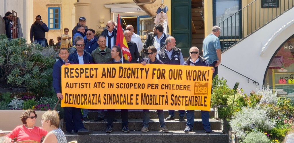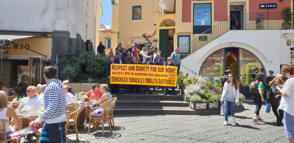 Manifestazione silenziosa nella piazzetta di Capri da parte di un gruppo di lavoratori dell’ Atc – l’ azienda di trasporto pubblico su gomma – che ha aderito allo sciopero nazionale e nello stesso tempo ha voluto portare anche la propria protesta nei confronti dell’ azienda isolana. I lavoratori dopo essere arrivati in piazzetta a metà mattinata si sono posizionati sulle scale della chiesa ed hanno esposto un grosso striscione sul quale erano scritti in italiano ed inglese i motivi dello sciopero con le frasi: «Respect and dignity for our work! Autisti Atc in sciopero per chiedere democrazia sindacale e mobilità sostenibile».
