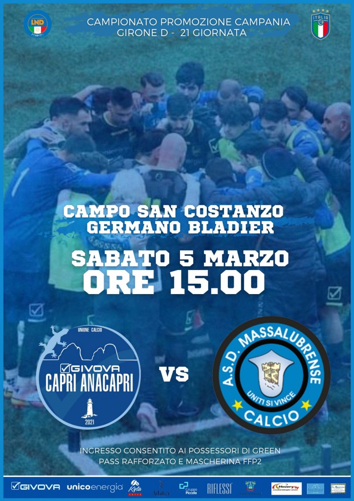 Sabato 5 marzo alle 15.00 allo stadio San Costanzo si terrà l’atteso incontro tra l’Uc Givova Capri Anacapri e il Massa Lubrense, capolista incontrastato del girone D della Promozione Campana.