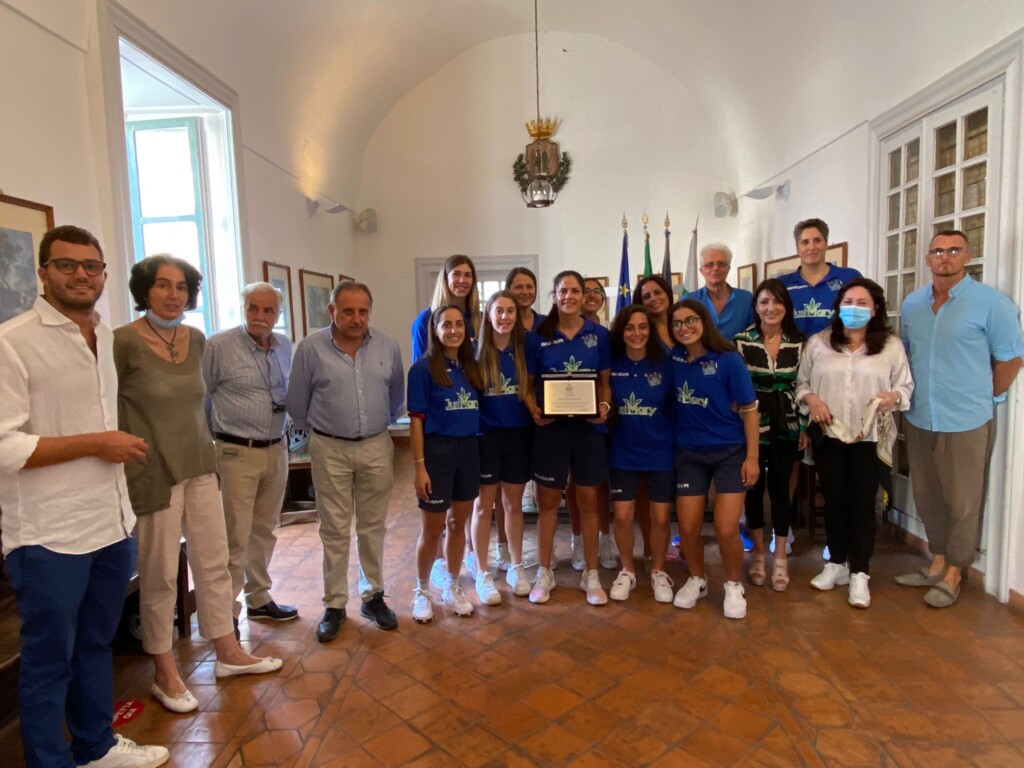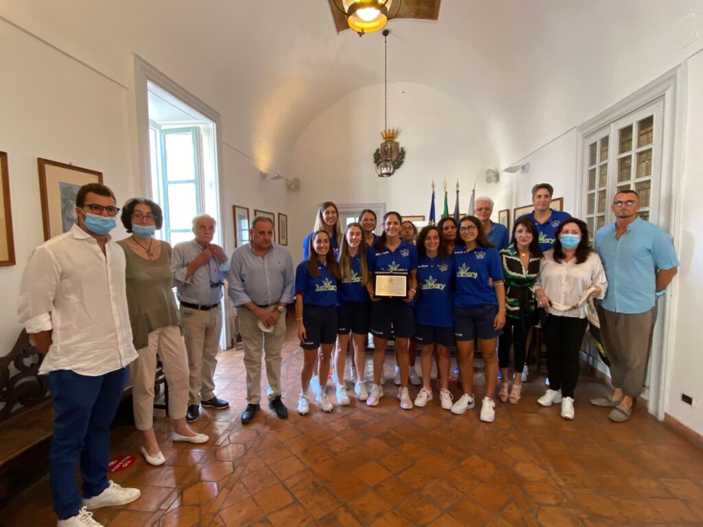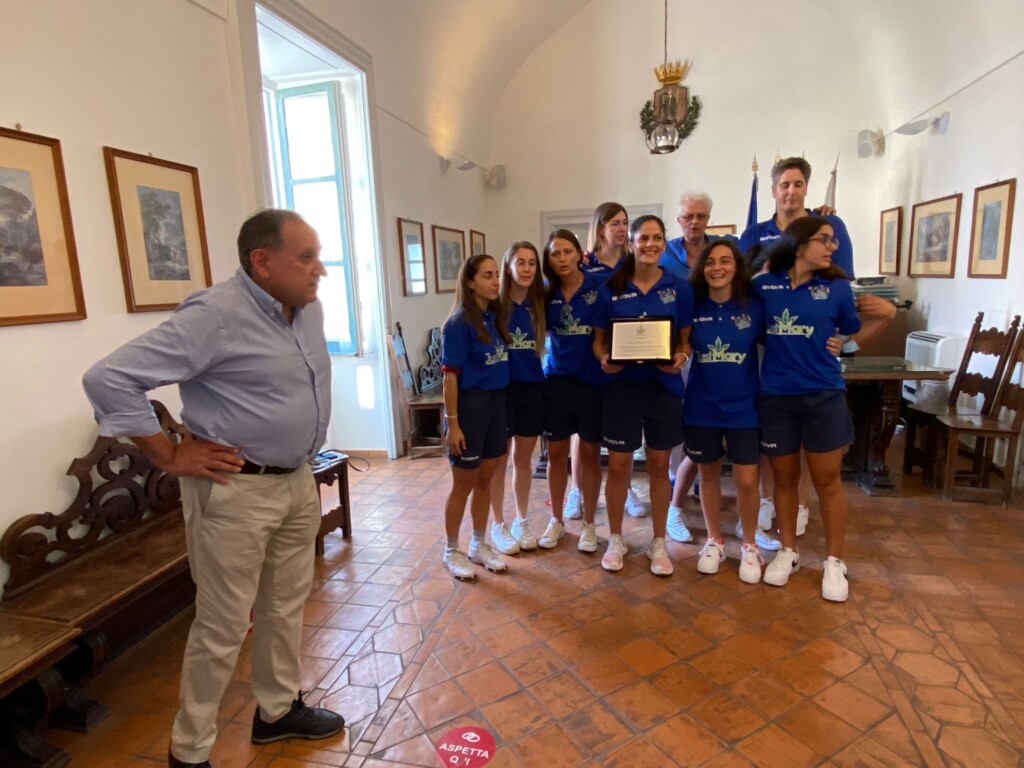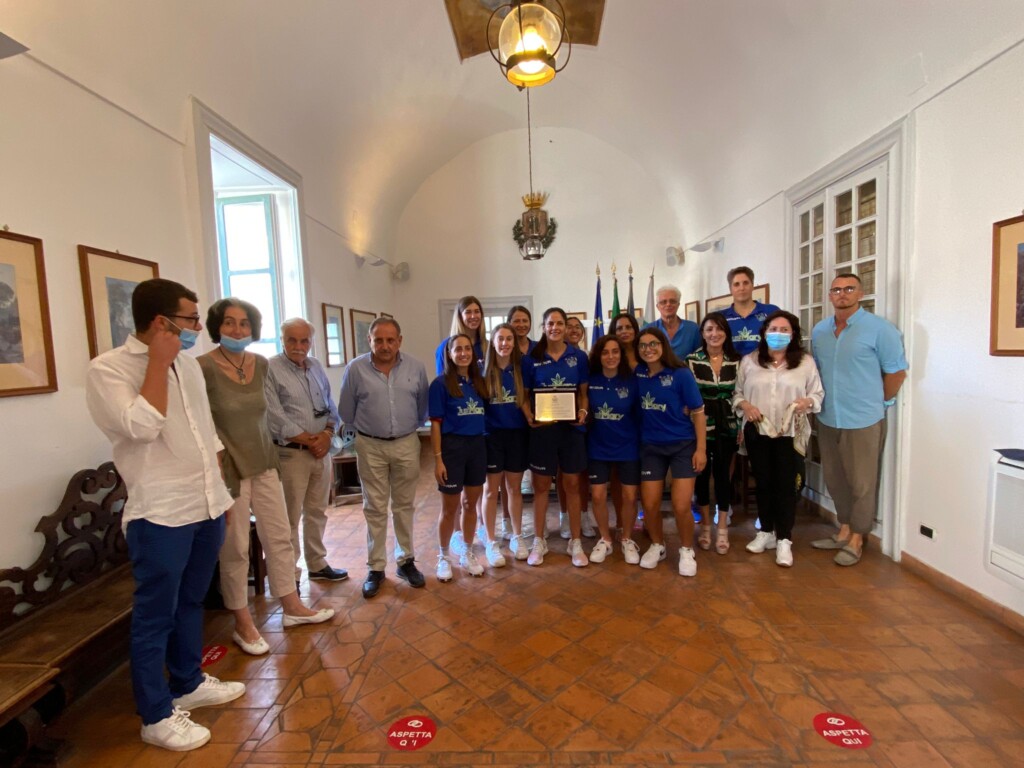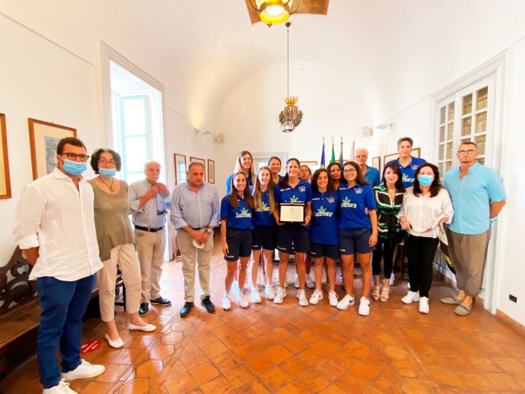 Oggi pomeriggio sentita cerimonia in Comune per festeggiare la squadra di basket femminile caprese, la Blue Lizard Capri (Lucertola Azzurra), che ieri in un’accesa finale ha battuto Costa Masnaga per 85 a 70 raggiungendo una storica promozione nelle serie A2 femminile di basket. A ricevere la targa che il Comune ha voluto regalare a questo straordinario team caprese è stato il Sindaco Marino Lembo ed il vice Sindaco ed Assessore allo sport Ciro Lembo unitamente alla Giunta che ha dato ufficialità ad un traguardo che è stato raggiunto con grandi sforzi dalla Blue Lizard Capri che in pieno covid ha dovuto sottoporsi a notevoli difficoltà specie per i trasferimenti dall’isola alla terraferma. Oggi però nella sala consiliare del Comune di Capri le ragazze della Blue Lizard hanno festeggiato e già stanno pensando agguerrite al prossimo campionato che dovranno affrontare con la stessa grinta che le ha portate a questa storica promozione.