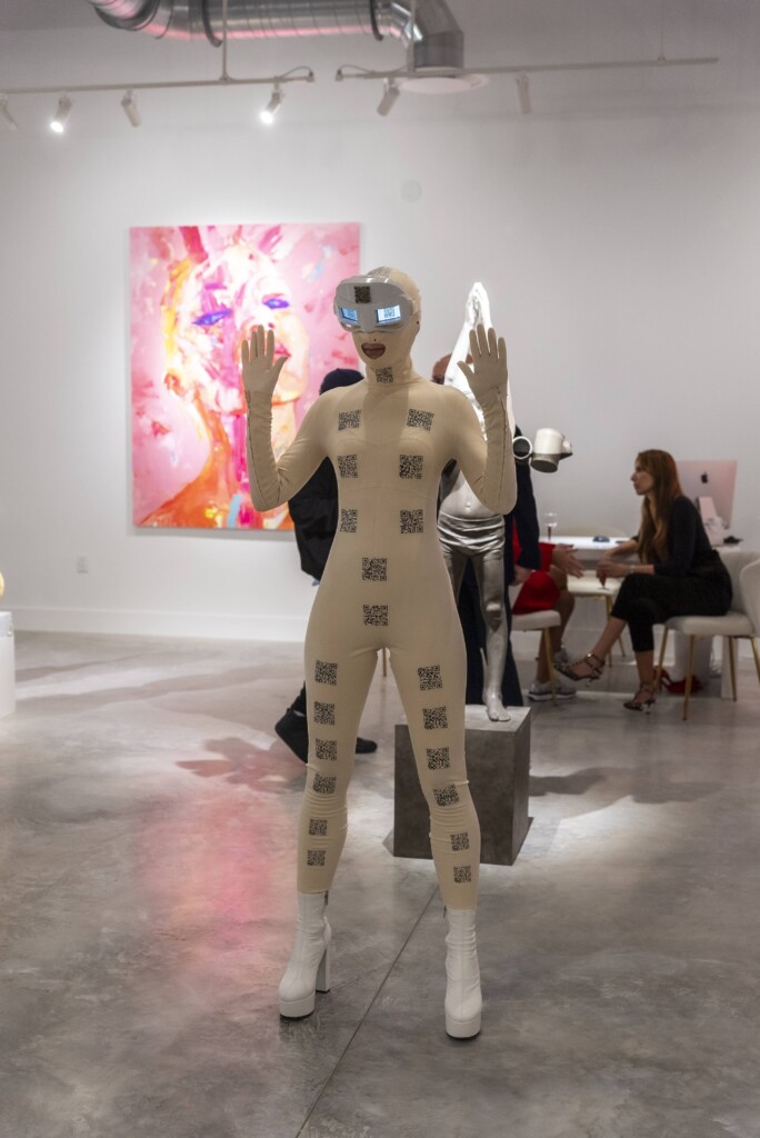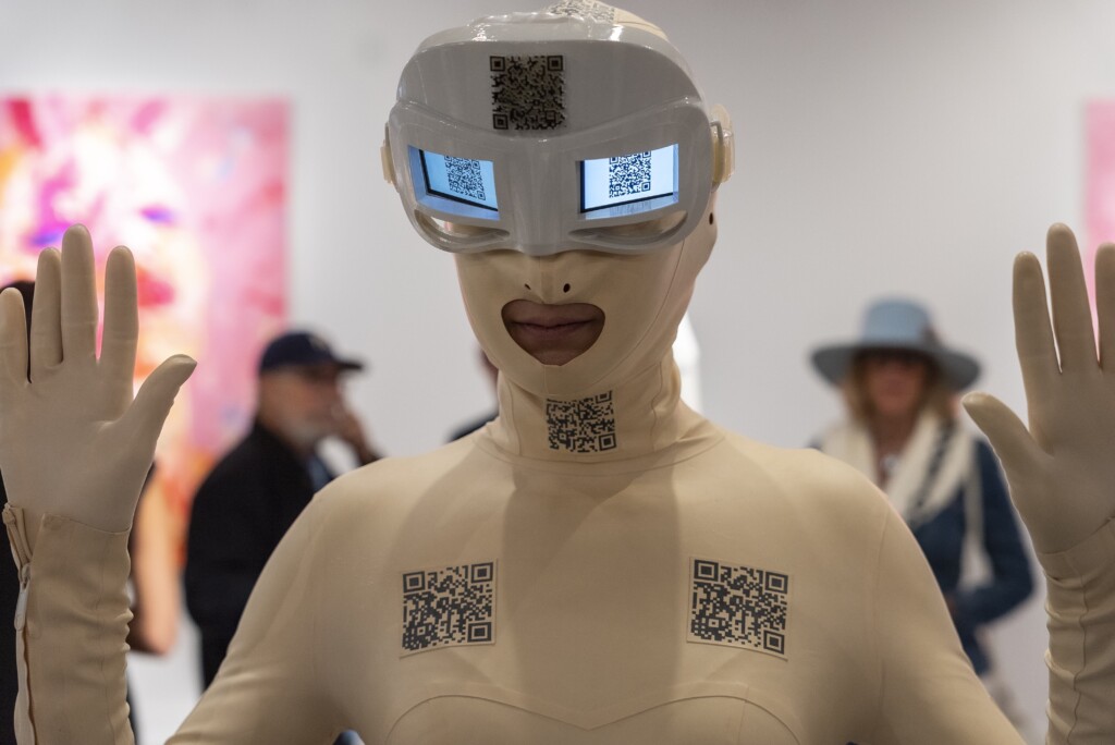 Durante la performance, il pubblico potrà scansionare i QR code stampati sulla tuta dell’artista utilizzando i propri cellulari, esplorando le conversazioni ChatGPT sul corpo umano.