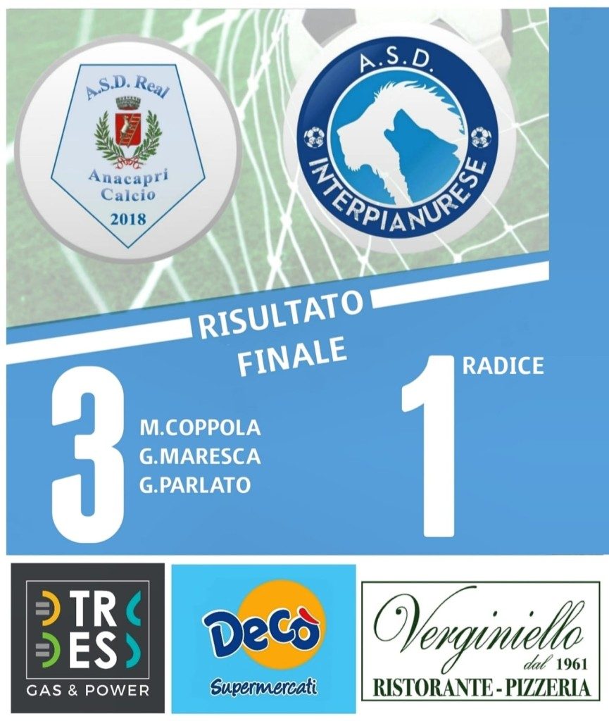 Nella seconda frazione di gioco l’Interpianurese pareggia con una rete del suo numero 11 Radice. Dopo qualche minuto il Real Anacapri metabolizza il pareggio ed è artefice di un’ottima reazione. Riprende la partita con una rete di G. Maresca che raccoglie un cross proveniente dalla destra e fredda nel cuore dell’area ospite il portiere dell’Interpianurese.