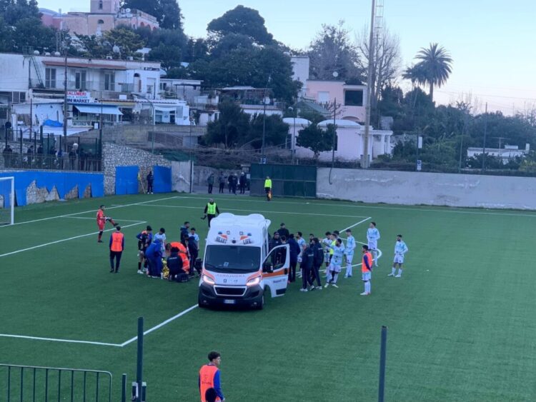 Un’ambulanza in campo durante la partita Givova Capri Anacapri Castel Volturno, per soccorrere un calciatore che si è infortunato. Il match è stato interrotto per più di trenta minuti. Capri, ambulanza in campo durante la partita contro il Castel Volturno Durante la partita delle ventitreesima giornata del girone A di Eccellenza tra Givova Capri Anacapri e Castel Volturno, la partita è stata sospesa per diversi minuti al San Costanzo. La partita è stata sospesa al 78° minuto quando il portiere Marino è intervenuto su Di Dato, che correva in area, con l’Anacapri in vantaggio per 1 a 0. L’arbitro ha fermato il violento urto e la sfida, permettendo all’ambulanza di portare il calciatore in ospedale per le cure del caso. ‘La società A.S.D. Castel Volturno Calcio si legge augura al calciatore una pronta guarigione, con la speranza di rivederlo al più presto in campo’. La partita, ripresa dopo oltre trenta minuti di stop, si è conclusa con il risultato di 1-0 (gol di Principe al 34′).