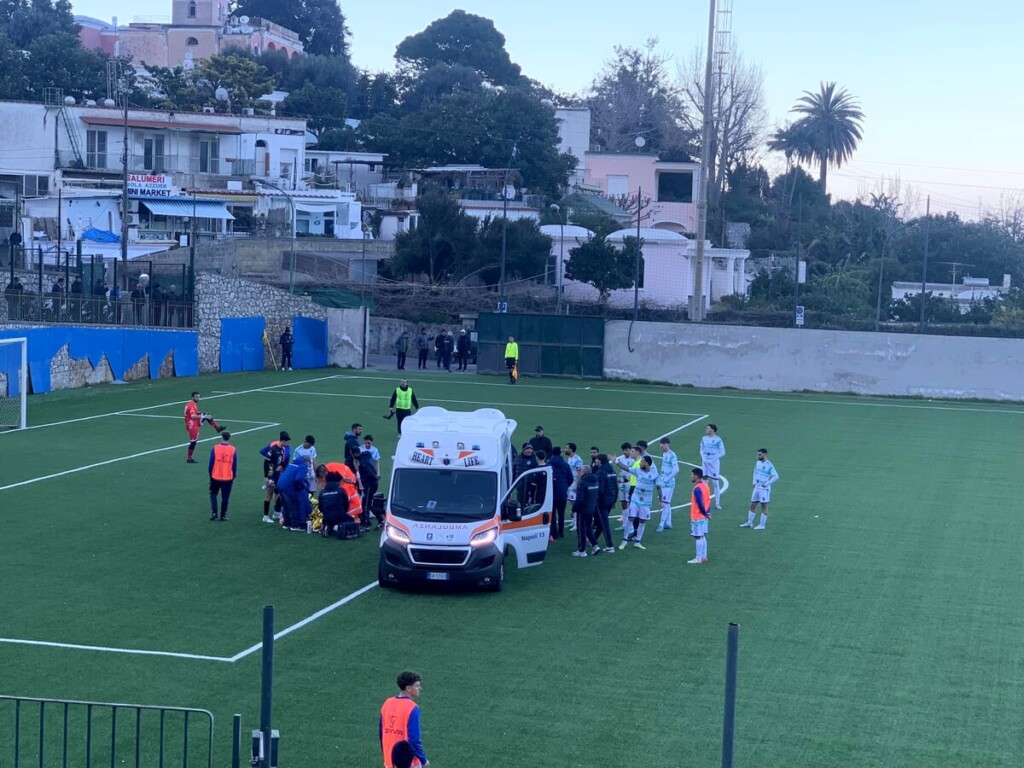 Un’ambulanza in campo durante la partita Givova Capri Anacapri Castel Volturno, per soccorrere un calciatore che si è infortunato. Il match è stato interrotto per più di trenta minuti. Capri, ambulanza in campo durante la partita contro il Castel Volturno Durante la partita delle ventitreesima giornata del girone A di Eccellenza tra Givova Capri Anacapri e Castel Volturno, la partita è stata sospesa per diversi minuti al San Costanzo. La partita è stata sospesa al 78° minuto quando il portiere Marino è intervenuto su Di Dato, che correva in area, con l’Anacapri in vantaggio per 1 a 0. L’arbitro ha fermato il violento urto e la sfida, permettendo all’ambulanza di portare il calciatore in ospedale per le cure del caso. ‘La società A.S.D. Castel Volturno Calcio si legge augura al calciatore una pronta guarigione, con la speranza di rivederlo al più presto in campo’. La partita, ripresa dopo oltre trenta minuti di stop, si è conclusa con il risultato di 1-0 (gol di Principe al 34′).