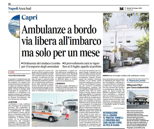 Consentire il trasferimento dei pazienti in ambulanza a bordo dei traghetti. Per mettere fine temporaneamente all’ emergenza legata al trasporto degli ammalati sulla terraferma sui traghetti, dovuta al diniego delle compagnie di navigazione di imbarcare le ambulanze con pazienti a bordo, ieri mattina il sindaco di Capri Marino Lembo ha firmato un’ ordinanza che avrà durata sino al 31 luglio.