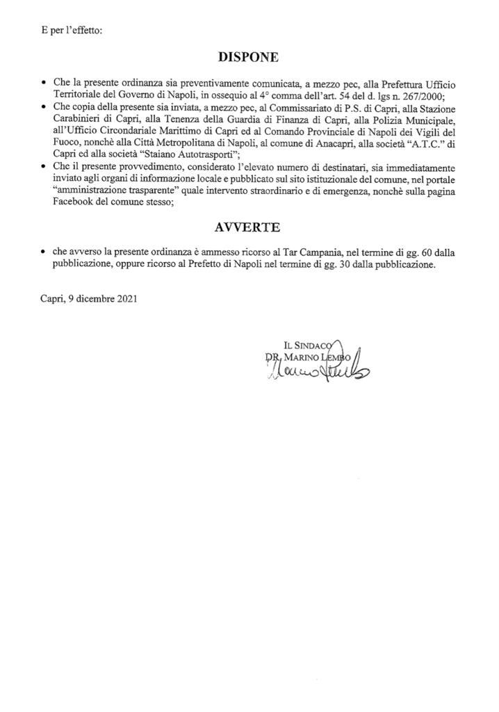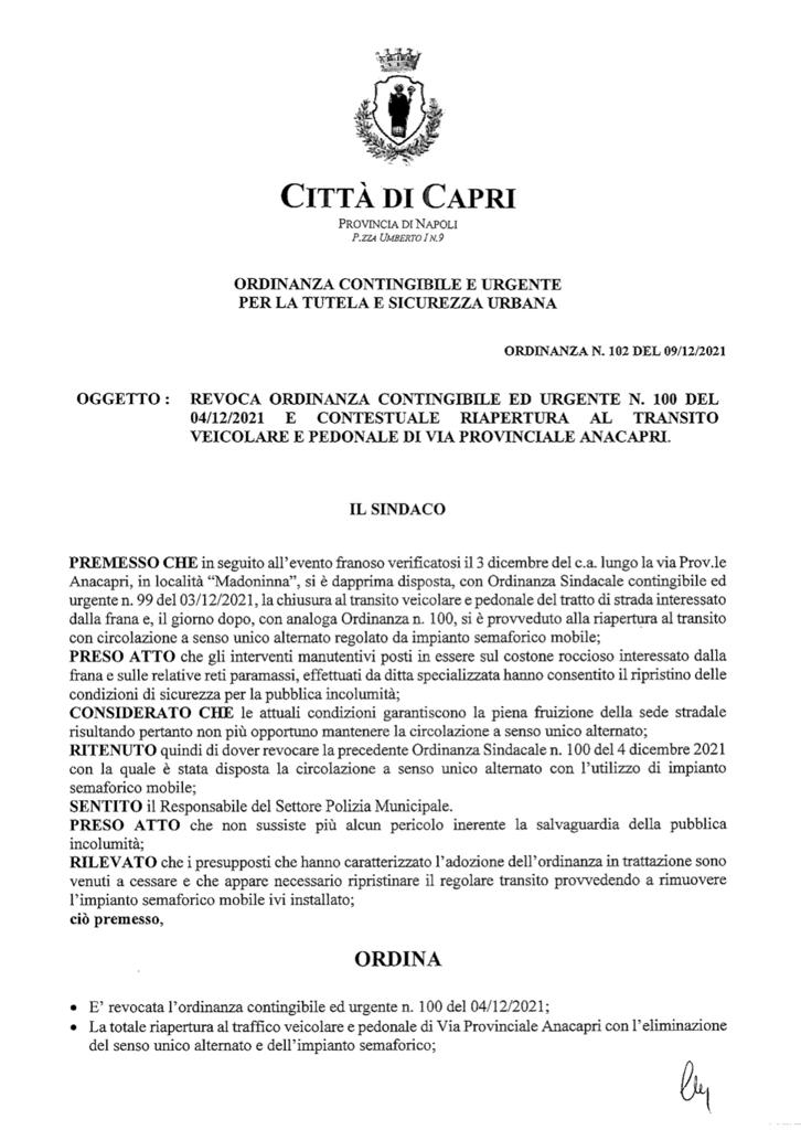 REVOCA ORDINANZA CONTINGIBILE ED URGENTE N. 100 DEL 04/12/2021 E CONTESTUALE RIAPERTURA AL TRANSITO VEICOLARE E PEDONALE DI VIA PROVINCIALE ANACAPRI.