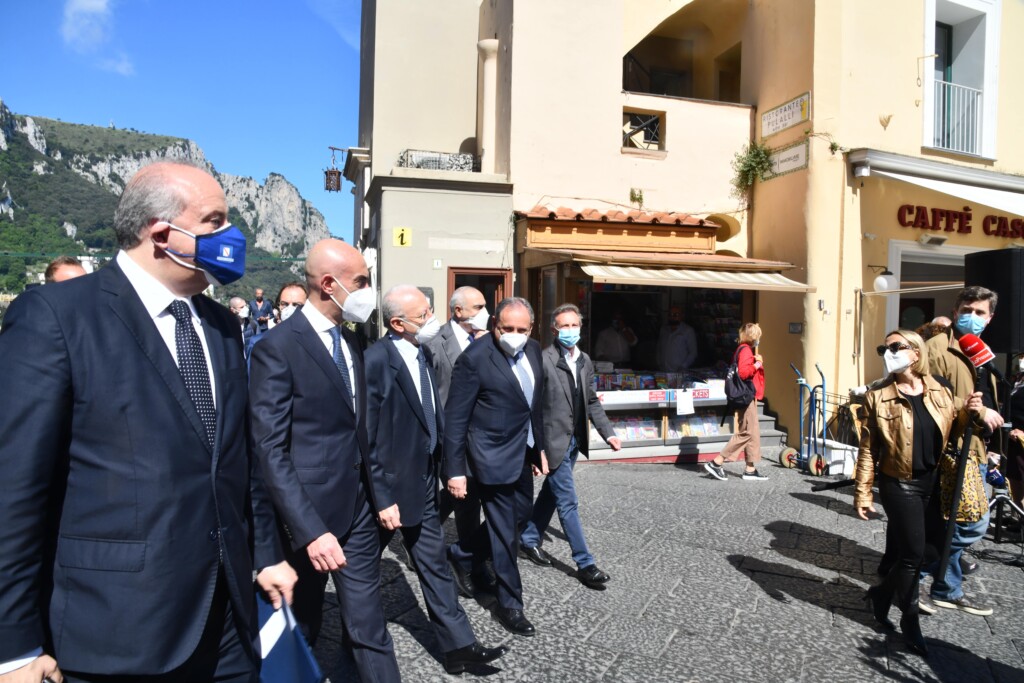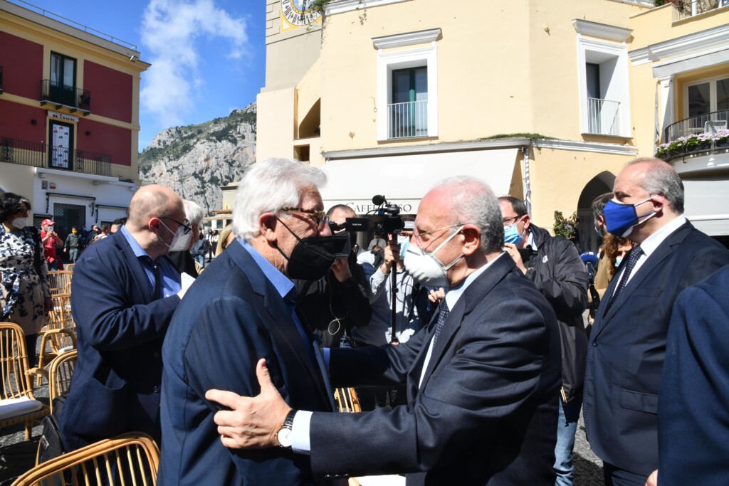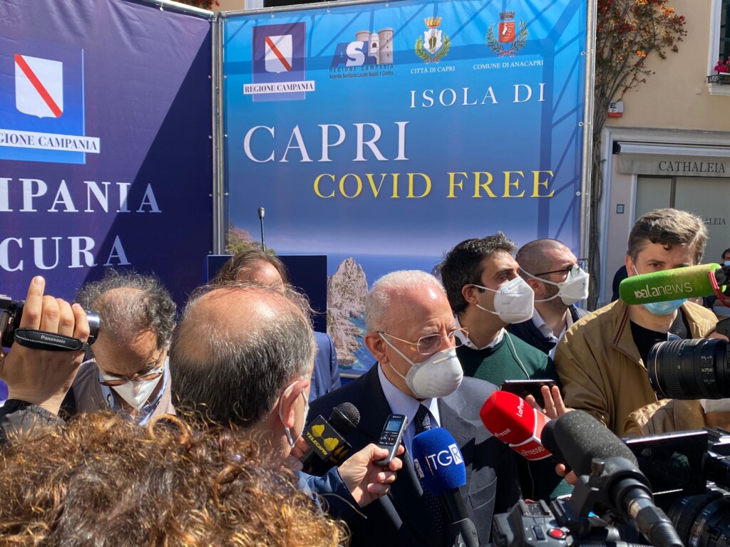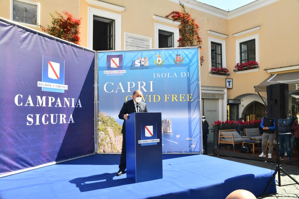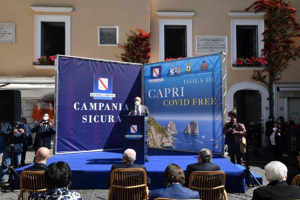 È una giornata di soddisfazione, direi di festa, e non solo per la Campania, ma per l’Italia, perché Capri è un brand mondiale”. Visibilmente soddisfatto, Vincenzo De Luca, annuncia dalla celebre piazzetta, dove è stato allestito un palco con il logo della Regione e la scritta “Campania sicura , la seconda isola “Covid free ” dopo Procida .”Quando due mesi abbiamo annunciato questo obbiettivo, sia per ragioni sanitarie, che per avere un rilancio internazionale del turismo campano e nazionale, c’è stata qualche incertezza. Oggi, mi pare che si siano convinti tutti”.La prossima tappa- annuncia il presidente della Giunta regionale- e’ Ischia , “tra due settimane”. Poi proseguiremo con Sorrento, Amalfi, arriveremo al Cilento per prepararci ad accogliere milioni di turisti ed evitare che se ne vadano in Spagna o in Grecia “.”L’ altro obbiettivo è quello di immunizzare la città di Napoli entro luglio”. De Luca rilancia la polemica con il Governo nazionale. “La pre-condizione, ovviamente, è che arrivino i vaccini, ancora oggi siamo a 200 mila in meno rispetto a quelli che dovremmo avere. E probabilmente dovremo chiudere lunedì la Mostra d’Oltremare per mancanza di vaccini. Sarebbe un delitto, lo denuncio ancora una volta”.Ma a Capri , dove spuntano i primi turisti. (“Le prospettive sono buone -, dice il consigliere delegato al turismo, Ludovica Di Meglio- stanno arrivando le prenotazioni dagli Usa”), l’atmosfera è rilassata e festosa. De Luca saluta in inglese i turisti e poi accenna una strofa di “Malafemmina” con il titolare di un noto locale, Guido Lembo. Ad ascoltarlo in piazzetta c’è anche Peppino Di Capri, con il quale si intrattiene a parlare. “L’ isola immunizzata ? Una grande idea. Adesso si può sperare. Penso soprattutto ai giovani, non sempre responsabili.” Ci sono prospettive migliori anche per lo spettacolo? “Si, finalmente. Si è parlato al massimo del teatro, ma i turisti hanno bisogno anche della nostra musica”.Insieme al direttore generale della Asl NA1, Ciro Verdoliva,che ha annunciato l’ inizio dei lavori di ristrutturazione dell’ospedale “Capilupi”, De Luca ha visitato poi i centri vaccinali di Anacapri e di Marina Grande.