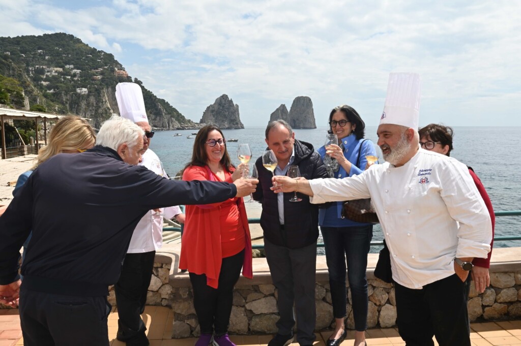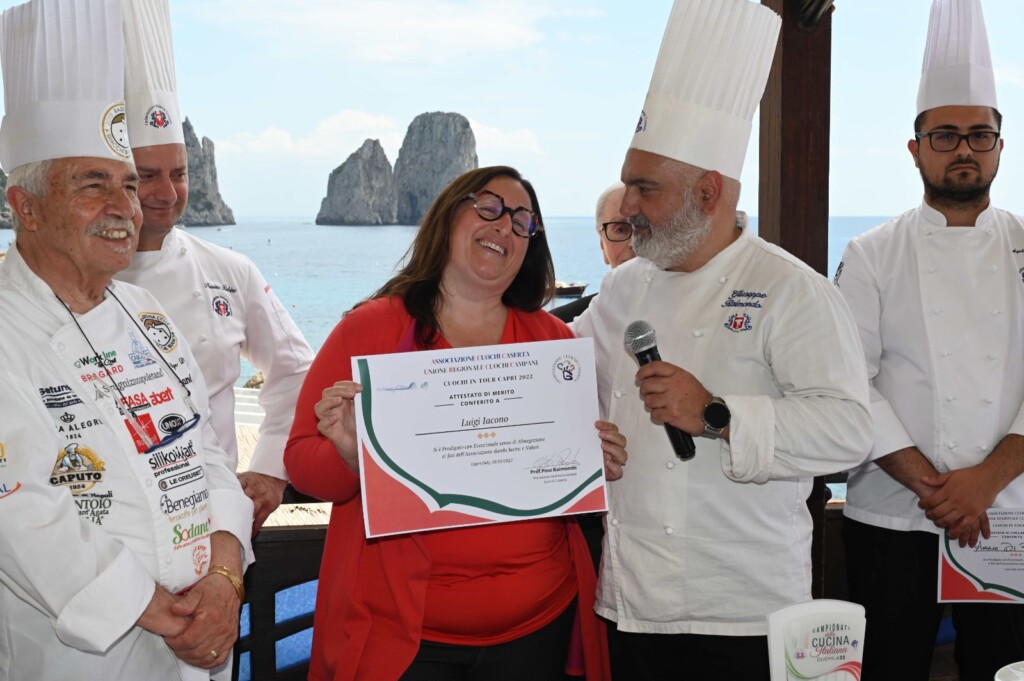 Si è tenuta ieri mattina sulla baia dei Faraglioni, nell’ esclusiva location de “La Canzone del Mare” , la cerimonia di celebrazione della competizione “cuochi in tour 2022” . Il team junior della Federazione italiana Cuochi Caserta è risultato vincitore dei Campionati di cucina italiana 20222 tenutisi lo scorso marzo a Rimini , vincendo l’ oro ai campionati della cucina italiana ed altri prestigiosi riconoscimenti. L’ occasione è stata un modo per la famiglia Iacono di dare il saluto benaugurale all’ avvio della stagione 2022 con la presenza delle cariche amministrative della città di Capri, tra cui il sindaco Marino Lembo , il vice sindaco Ciro Lembo , l’ assessore Paola Mazzina e l’ assessoreAnna De Simone. Grandi celebrazioni per il team casertano guidato da Pino Raimondo e Luisana Merola, rispettivamente presidente e segretario dell’Associazione Cuochi Caserta, che hanno riunito alla Canzone del Mare, sulla baia iconica dei Faraglioni, le eccellenze dei giovani chef campani, risultati vincitori della competizione riminese. La gara gastronomica tenutasi a Rimini ha visto le berrette bianche casertane aggiudicarsi ben 12 medaglie d’oro, 4 bronzi e il premio della critica gastronomica e il titolo di campioni d’Italia in assoluto. All’interno della cerimonia di celebrazione di ieri tanti gli attestati di merito conferiti dall’associazione ai vari leader del team di junior chef, promesse ed eccellenze della ristorazione italiana, tra di essi: Stefano Pista, chef di Villa Althea a Bellona), Lorenzo Lacriola, Angelo di Bona, Gennaro Gioia, Antonio D’Amore, Giovanni Fiore, Chef della Canzone del Mare e il suo sous chef Francesco Di Giacomo. Attestati al merito anche a Giuseppe Cimino, Antonio Pagano, Manfredo Pantone, Carmelo Barberi e Massimo Rubino. Una menzione speciale è stata assegnata anche alla famiglia Iacono, simbolo dell’ospitalità caprese nel mondo. A celebrare la vittoria del team campano anche due grandi chef italiani: Ennio Caprio ed Ugo D’Orso con trascorsi gastronomici che li legano alla storia della ristorazione isolana che hanno portato i saluti al team vincitore e allo chef della Canzone Giovanni Fiore. «Tanto il lavoro che c’è dietro questi traguardi – dichiara Luisana Merola – che sottolinea: è un lavoro con il territorio e per il territorio, quello portato avanti dalla nostra associazione che inizia nelle scuole tecniche di professionalizzazione ai mestieri di sala e cucina e continua in luoghi come la location prestigiosa della Canzone del Mare ad ospitarci qui oggi. Seguiamo i ragazzi attraverso il contesto federativo dell’associazione italiana cuochi e poi in quello associativo locale, per portarli raggiungere l’eccellenza sia nazionale che internazionale e risultati arrivano».