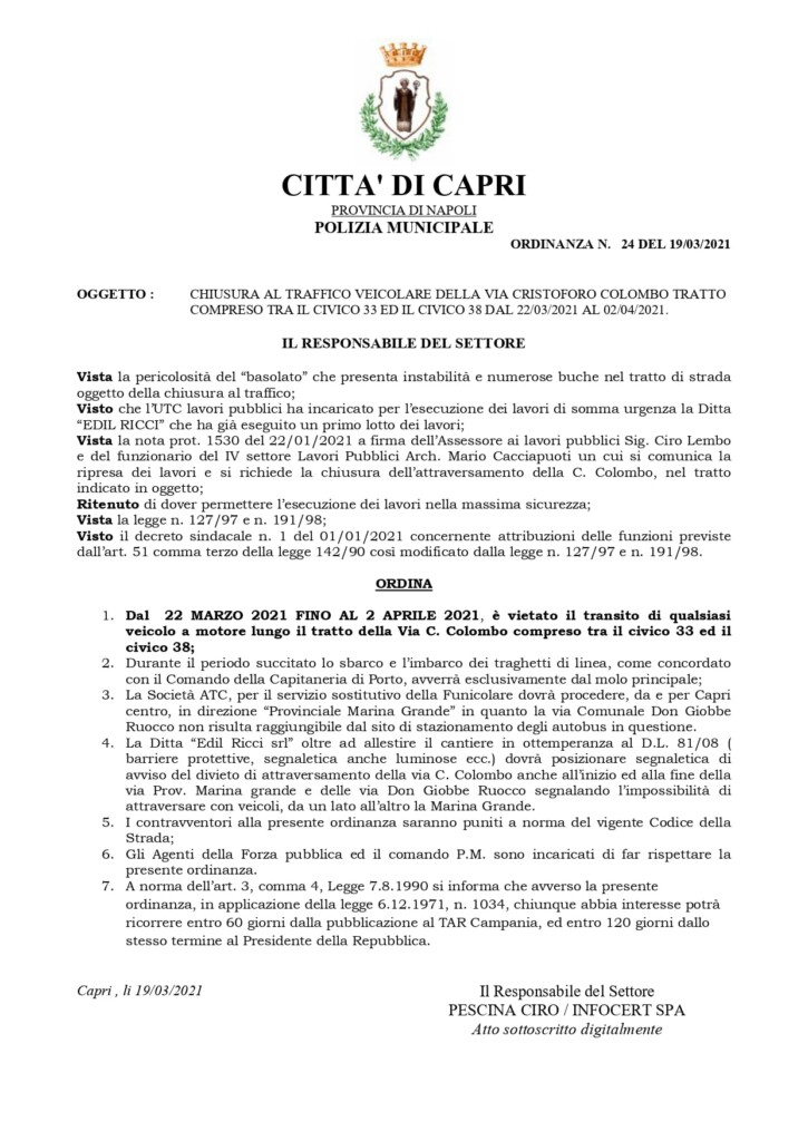 Capri: dal 22 marzo al 2 aprile chiuso un tratto di via Cristoforo Colombo