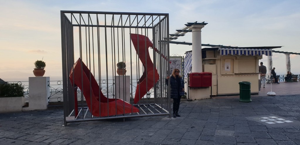 Nei prossimi giorni il tema della donna, soprattutto dell’ aspetto della violenza contro le donne, prenderà i primi titoli dei tg e dei giornali. A Capri, due enormi scarpe rosse con tacchi a spillo ingabbiate è l’ installazione artistica che ha fatto la sua comparsa nelle ultime ore in via Roma, accanto alla Piazzetta di Capri. “La violenza è una gabbia” è il titolo dell’ efficace opera esposta e davanti alla quale ci si deve per forza soffermare.