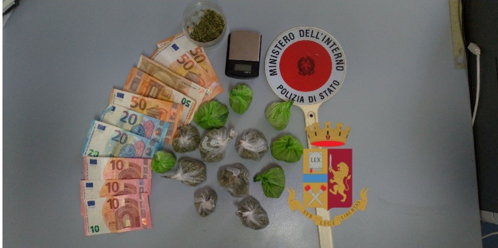La perquisizione personale, estesa all’abitazione, ha consentito di trovare all’interno di una scatola da gioco 13 confezioni di cellophane termosaldate contenenti sostanza erbacea di colore verde e la somma di € 320,00 in banconote di diverso taglio; inoltre in un barattolo di gelatina per capelli è stata rinvenuta altra sostanza erbacea verde, 2 trita tabacco, un bilancino di precisione, 3 buste per alimenti di colore bianco e 6 sacchetti biodegradabili di colore verde.
