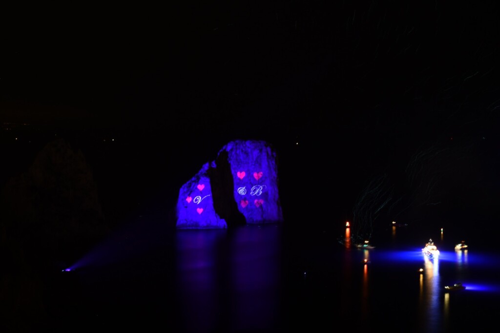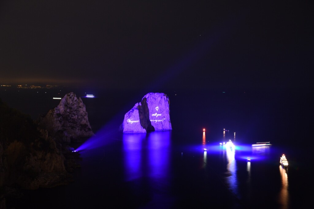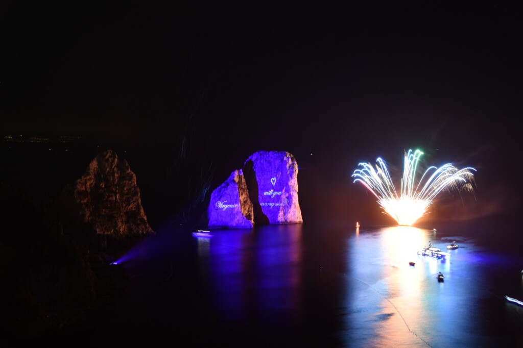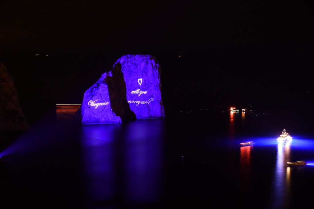 Notte magica ieri nella baia di marina piccola con i faraglioni illuminati d’azzurro mediante un faro che proiettava sulle rocce, dove abita la lucertola azzurra, la scritta della proposta di matrimonio fatta da un magnate innamorato tedesco: “Virginie Will You Merry Me?” (Virginia, mi vuoi sposare?). Le registe occulte di tutta la scenografia sono state due manager capresi di “Capri Moments”, agenzia caprese delle due intraprendenti manager Fabrizia Brunetti e Maria Consilia Ruotolo che hanno organizzato in tutta segretezza l’evento preparandolo nei minimi dettegli. Sullo Yacht che fiancheggiava i faraglioni da dove è partito uno straordinario spettacolo di fuochi artificiali, mentre un’orchestra a bordo dava il via allo show che è durato fin dopo mezza notte continuando lo spettacolo dei fuochi artificiali che ha illuminato anche la baia nel romantico ultimo weekend di fine settembre.