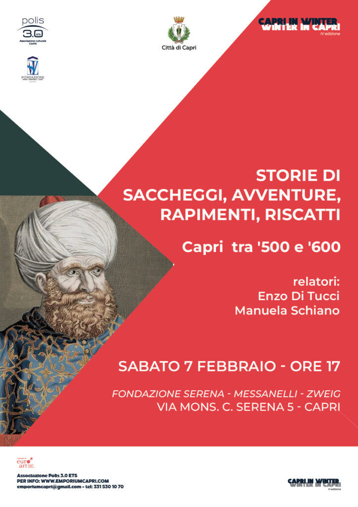 Prossimo appuntamento del calendario eventi del 2026 è fissato per il 7 febbraio con “Storie di saccheggi, rapimenti, riscatti: Capri tra ‘500 e ‘600” , relatori Manuela Schiano ed Enzo Di Tucci.