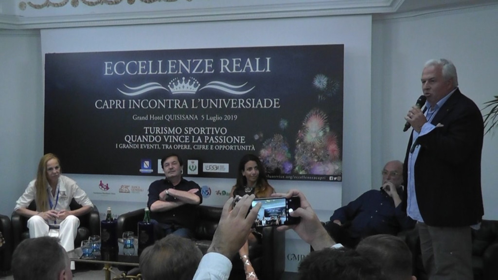 Sono intervenuti tra gli altri i delegati, i Campioni olimpici ed ambasciatori CONI: Patrizio Oliva, Franco Porzio, Mauro Sarmiento, il maestro Gianni Maddaloni, il promoter Luciano Cotena, il campione di wrestling Giuseppe King Danza, il rettore dell’università di videogiochi IUDAV Don Patrizio Coppola, i dirigenti calcistici federali Ferdinando Arcopinto e Felicio De Luca, i manager d’impresa Francesco Trebisonda, Asad Ventrella e Chiara Di Gennaro. A nome di FISU e comitato organizzatore Universiadi 2019 Coline Fransen ed Anna Paola Voto hanno ringraziato per l’ospitalità e l’opportunità di poter vivere alla grande famiglia delle Universiadi una giornata a Capra laddove non si svolgono competizioni ma è stata assegnata la medagli dell’allegria. Ha concluso i lavori portando i saluti istituzionali l’assessore Salvatore Ciuccio per la città di Capri.